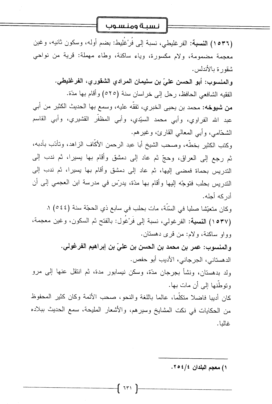 (1537) النسبة: الفرغولي، نسبة إلى فَرْغُول: بالفتح ثم السكون، وغين معجمة، وواو ساكنة، ولام: من قرى دهستان.