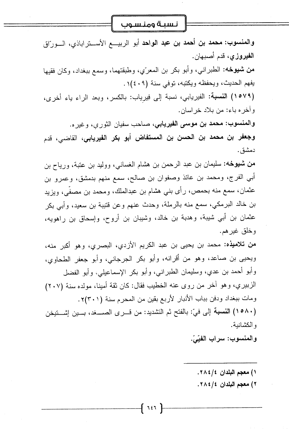 (1579) النسبة: الفيريابي، نسبة إلى فِيرِياب: بالكسر، وبعد الراء ياء أخرى، وآخره باء: من بلاد خراسان.