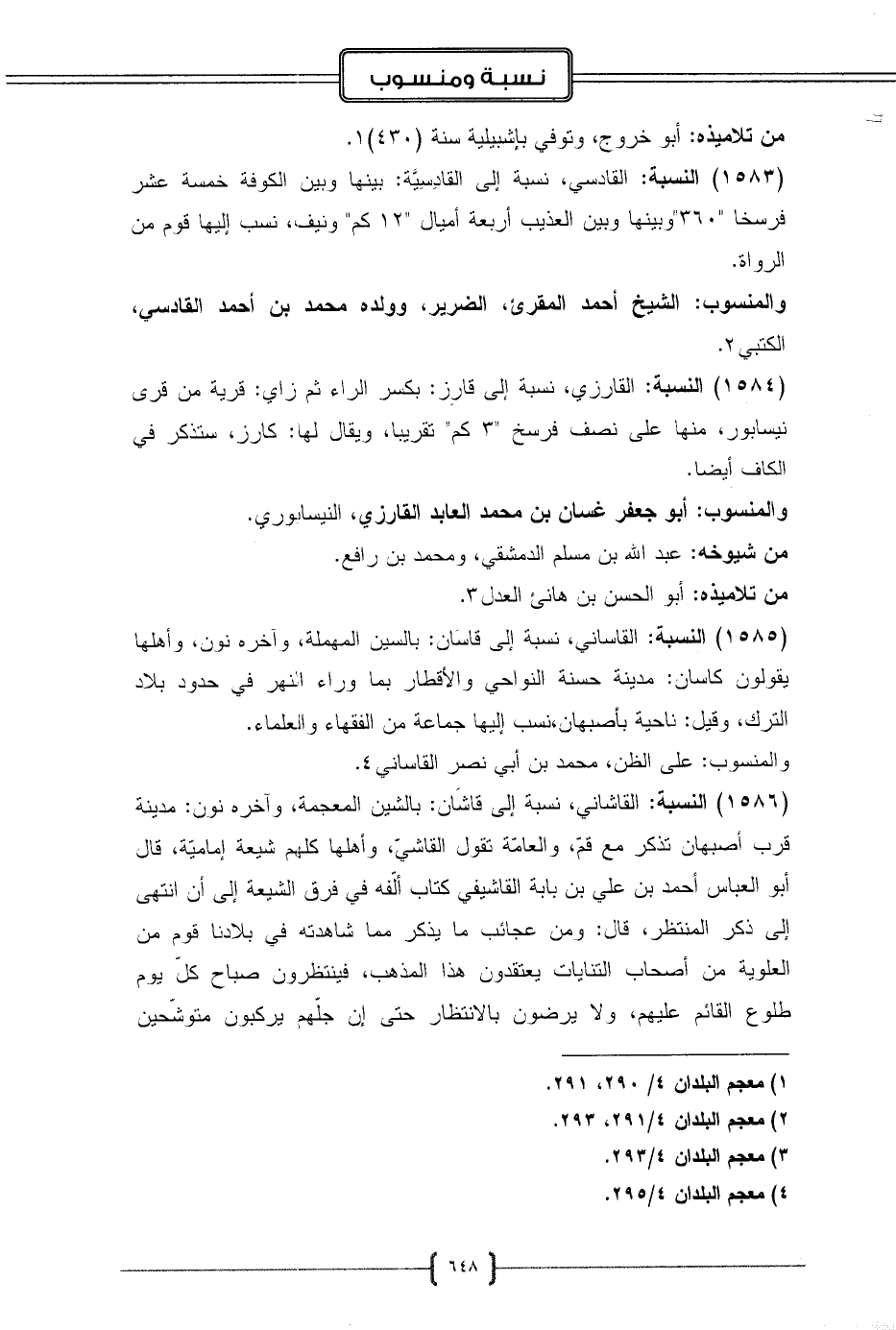 (1583) النسبة: القادسي، نسبة إلى القادِسِيَّة: بينها وبين الكوفة خمسة عشر فرسخا "360" وبينها وبين العذيب أربعة أميال "12 كم" ونيف، نسب إليها قوم من الرواة.
