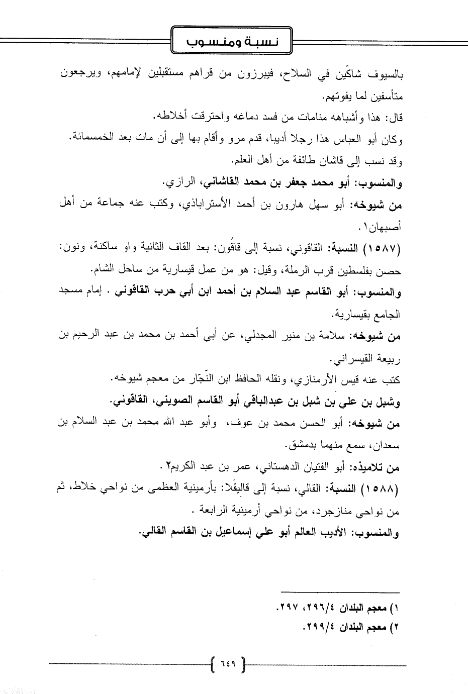 (1587) النسبة: القاقوني، نسبة إلى قاقُون: بعد القاف الثانية واو ساكنة، ونون: حصن بفلسطين قرب الرملة، وقيل: هو من عمل قيسارية من ساحل الشام.