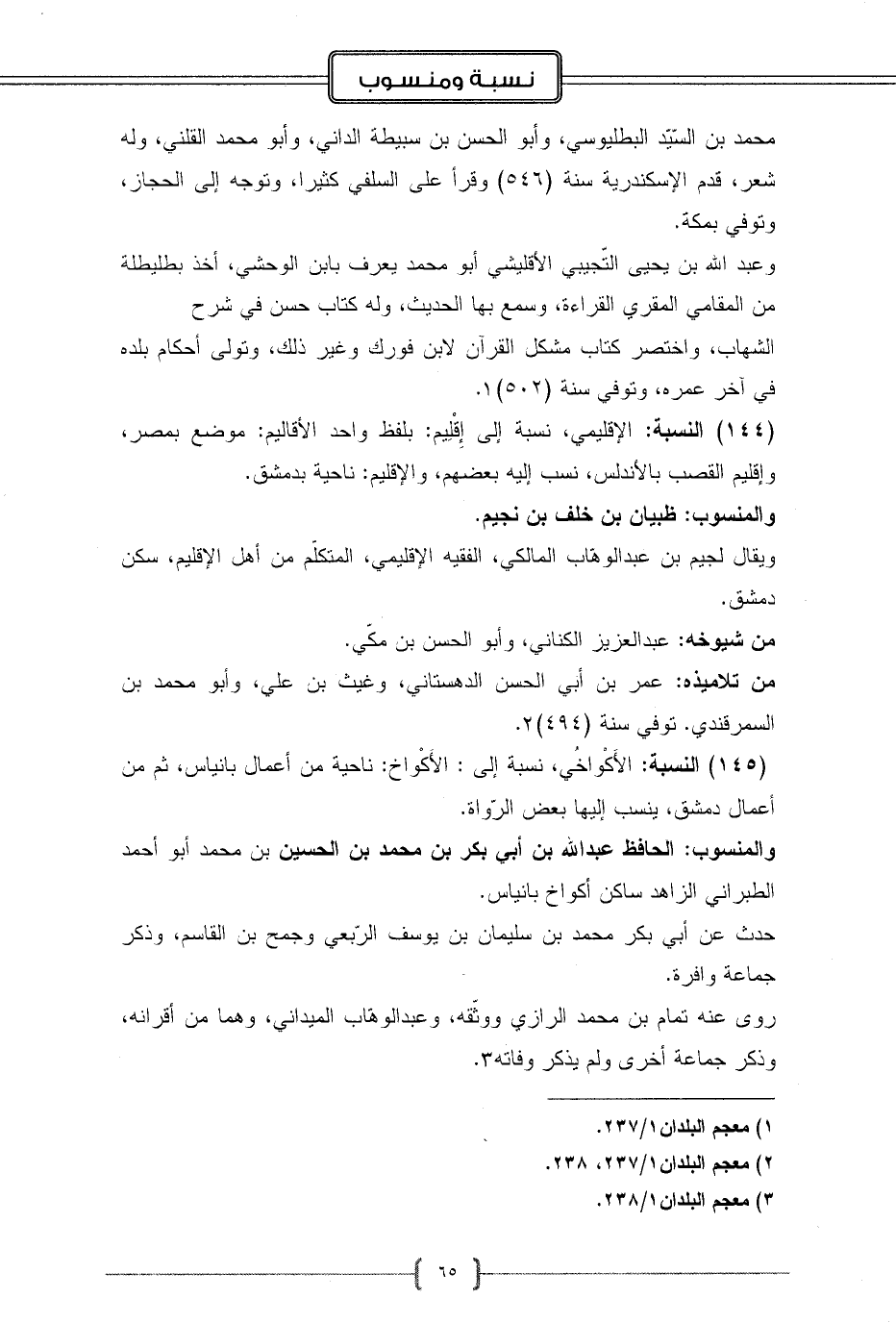 (144) النسبة: الإقليمي، نسبة إلى إِقْلِيم: بلفظ واحد الأقاليم: موضع بمصر، وإقليم القصب بالأندلس، نسب إليه بعضهم، والإقليم: ناحية بدمشق.