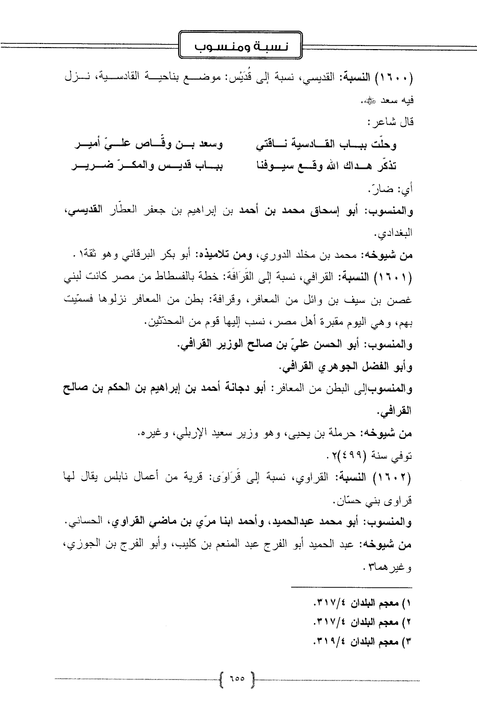 (1600) النسبة: القديسي، نسبة إلى قُدَيْس: موضع بناحية القادسية، نزل فيه سعد - رضي الله عنه -.