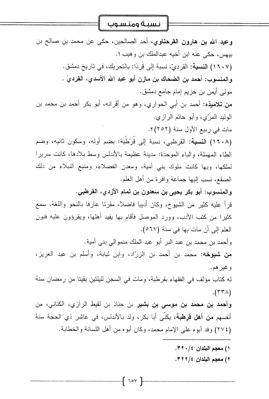 (1608) النسبة: القرطبي، نسبة إلى قُرْطُبَة: بضم أوله، وسكون ثانيه، وضم الطاء المهملة، والباء الموحدة: مدينة عظيمة بالأندلس وسط بلادها، كانت سريرا لملكها، وبها كانت ملوك بني أمية، ومعدن الفضلاء، ومنبع النبلاء من ذلك الصقع، نسب إليها جماعة وافرة من أهل العلم.