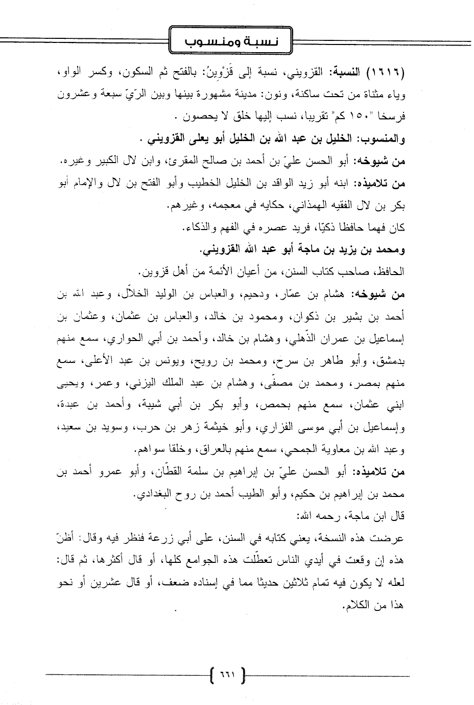 (1616) النسبة: القزويني، نسبة إلى قَزْوِينُ: بالفتح ثم السكون، وكسر الواو، وياء مثناة من تحت ساكنة، ونون: مدينة مشهورة بينها وبين الرّيّ سبعة وعشرون فرسخا "150 كم" تقريبا، نسب إليها خلق لا يحصون.