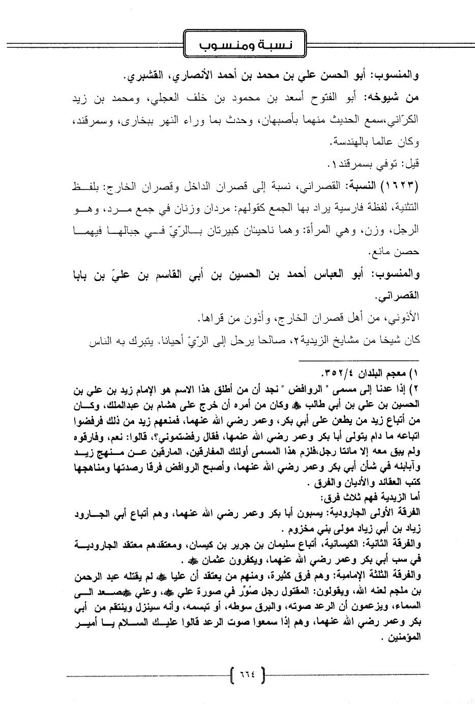 (1623) النسبة: القصراني، نسبة إلى قصران الداخل وقصران الخارج: بلفظ التثنية، لفظة فارسية يراد بها الجمع كقولهم: مردان وزنان في جمع مرد، وهو الرجل، وزن، وهي المرأة: وهما ناحيتان كبيرتان بالرّيّ في جبالها فيهما حصن مانع.