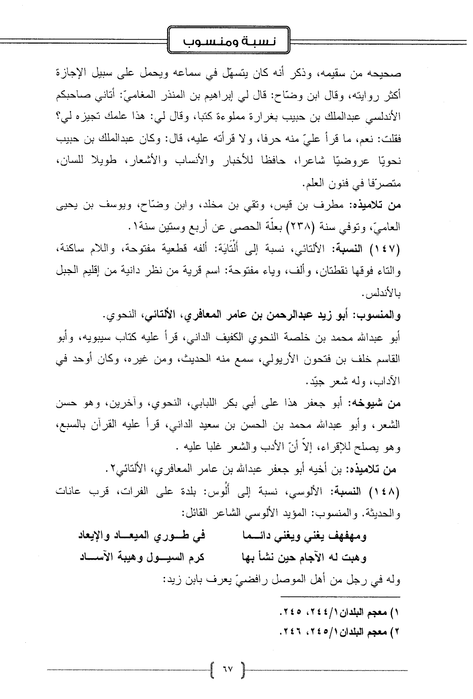 (148) النسبة: الألوسي، نسبة إلى أَلُوس: بلدة على الفرات، قرب عانات والحديثة. والمنسوب: المؤيد الألوسي الشاعر القائل: