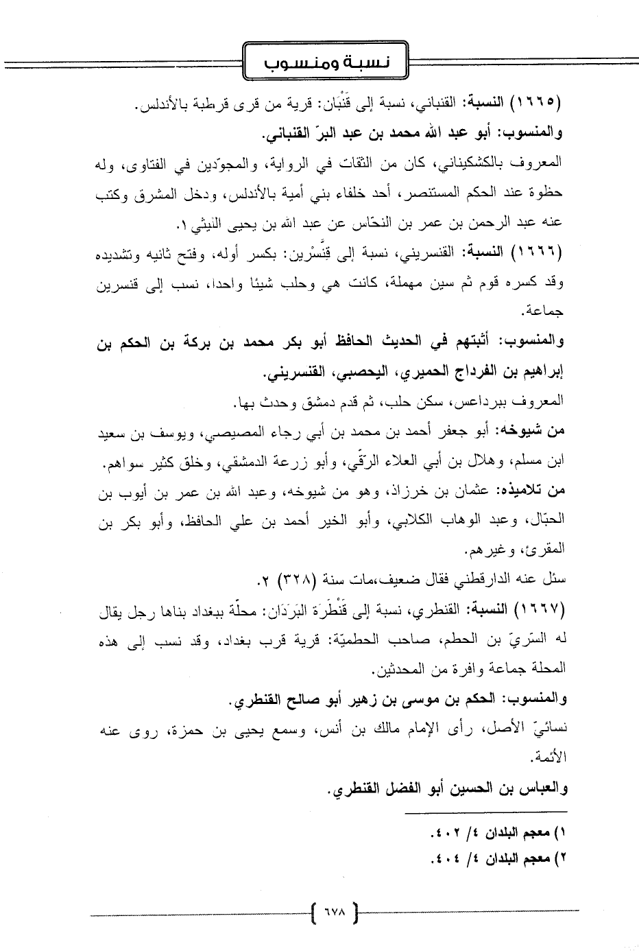 (1666) النسبة: القنسريني، نسبة إلى قِنَّسْرين: بكسر أوله، وفتح ثانيه وتشديده وقد كسره قوم ثم سين مهملة، كانت هي وحلب شيئا واحدا، نسب إلى قنسرين جماعة.