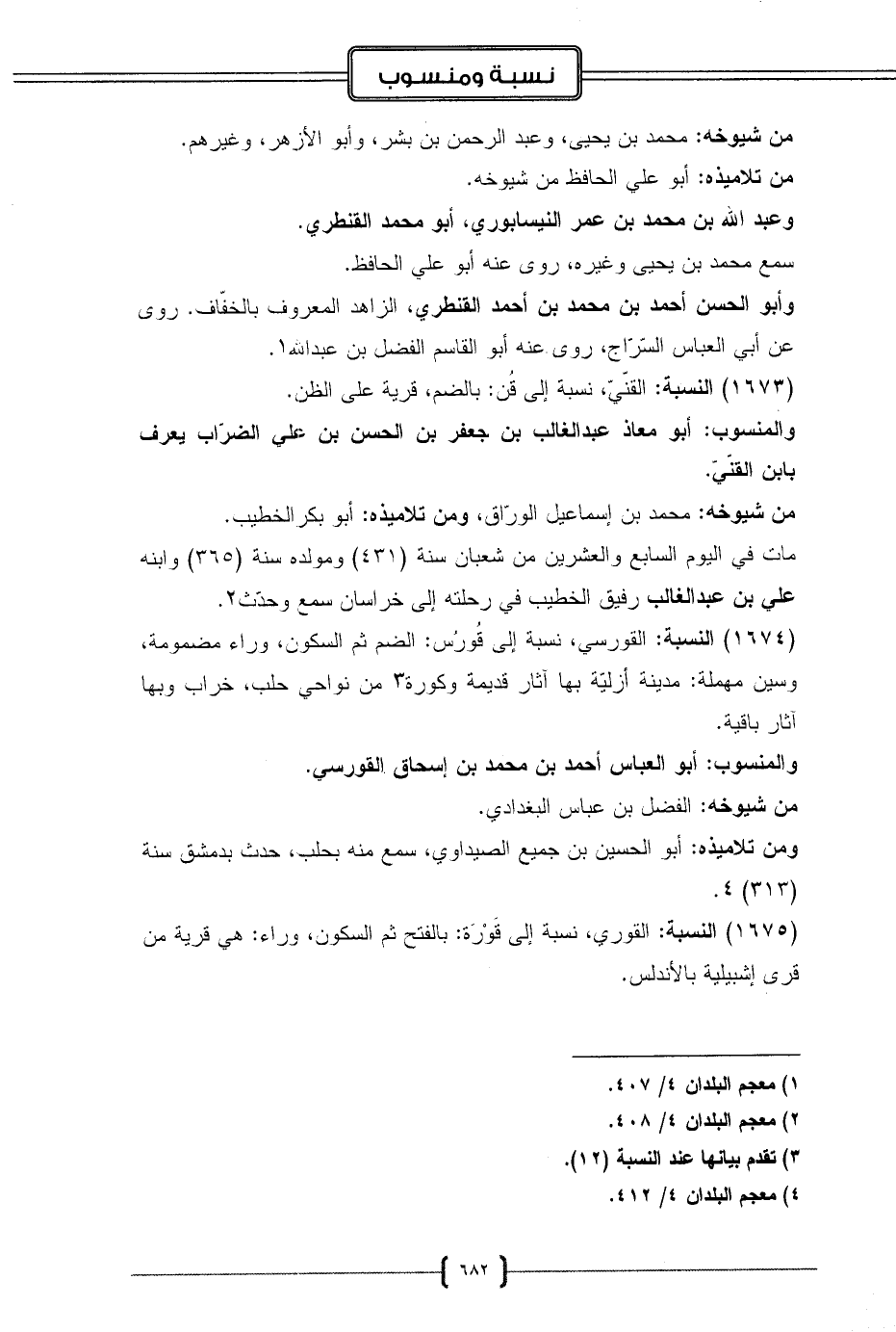 (1674) النسبة: القورسي، نسبة إلى قُورُس: الضم ثم السكون، وراء مضمومة، وسين مهملة: مدينة أزليّة بها آثار قديمة وكورة (¬3) من نواحي حلب، خراب وبها آثار باقية.
