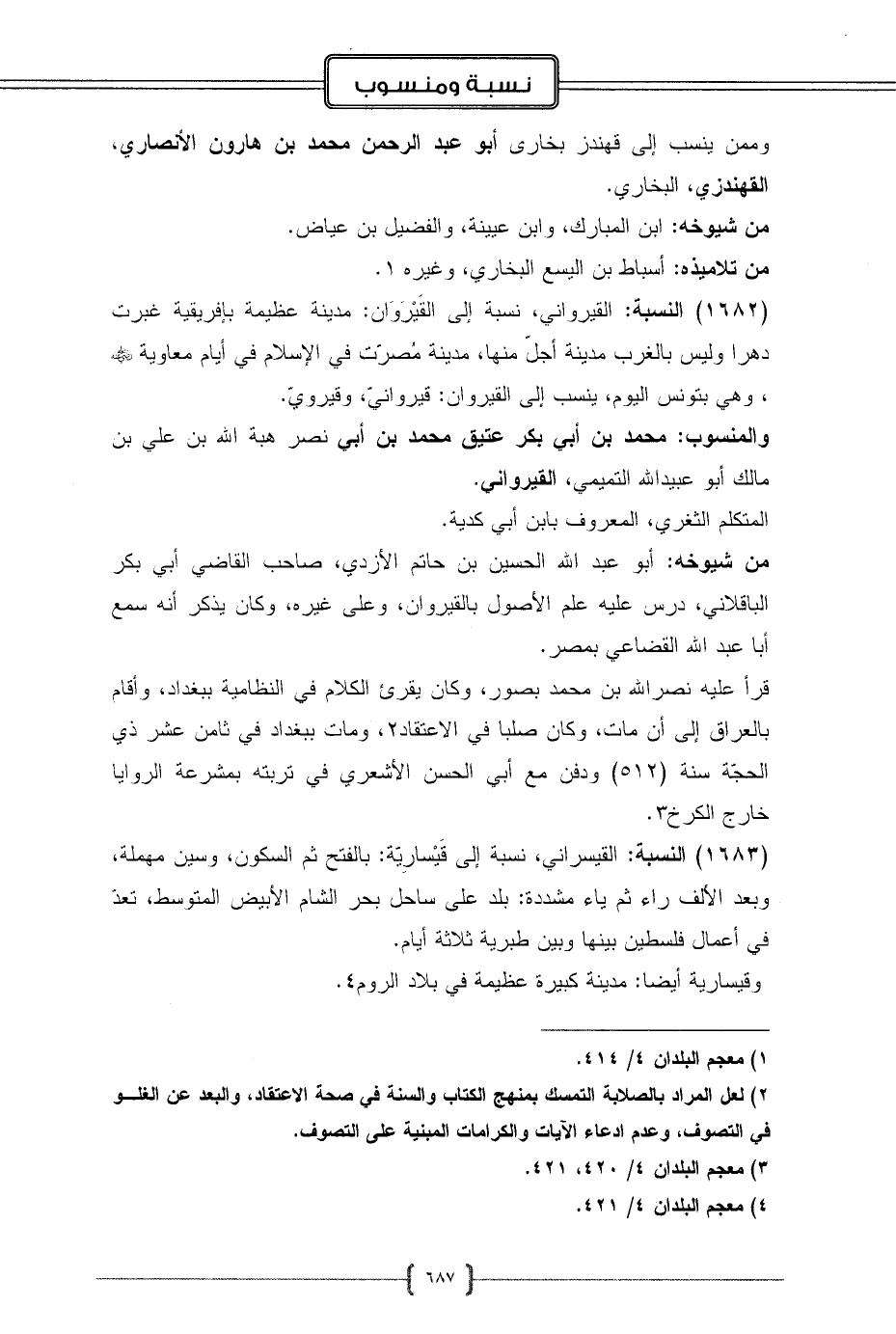 (1682) النسبة: القيرواني، نسبة إلى القَيْرَوَان: مدينة عظيمة بإفريقية غبرت دهرا وليس بالغرب مدينة أجلّ منها، مدينة مُصرّت في الإسلام في أيام معاوية - رضي الله عنه -، وهي بتونس اليوم، ينسب إلى القيروان: قيروانيّ، وقيرويّ.