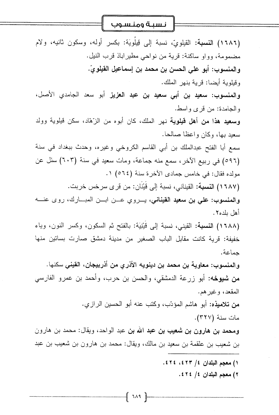 (1686) النسبة: القيلويّ، نسبة إلى قِيلُويَة: بكسر أوله، وسكون ثانيه، ولام مضمومة، وواو ساكنة: قرية من نواحي مطيراباذ قرب النيل.