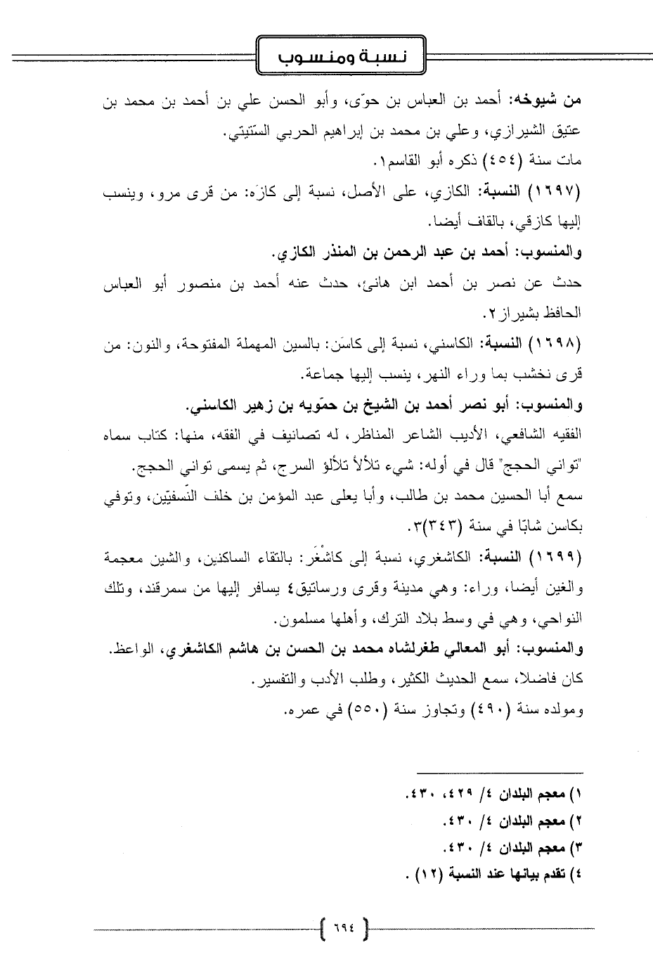 (1699) النسبة: الكاشغري، نسبة إلى كاشْغَر: بالتقاء الساكنين، والشين معجمة والغين أيضا، وراء: وهي مدينة وقرى ورساتيق (¬4) يسافر إليها من سمرقند، وتلك النواحي، وهي في وسط بلاد الترك، وأهلها مسلمون.