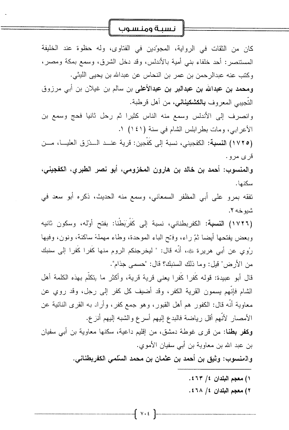 (1726) النسبة: الكفربطناني، نسبة إلى كَفْرَبَطْنا: بفتح أوّله، وسكون ثانيه وبعض يفتحها أيضا ثمّ راء، وفتح الباء الموحدة، وطاء مهملة ساكنة، ونون، وفيها رُوي عن أبي هريرة - رضي الله عنه -، أنّه قال: " ليخرجنكم الروم منها كَفرا كَفرا إلى سنبك من الأرض" قيل: وما ذلك السنبك؟ قال: "حسمى جذام".