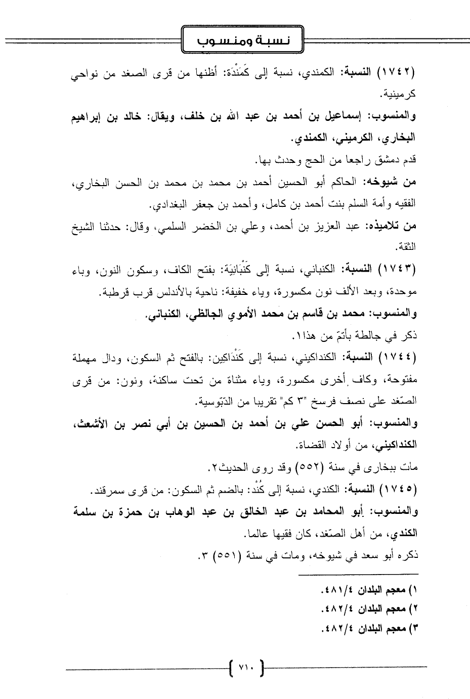(1744) النسبة: الكنداكيني، نسبة إلى كَنْدَاكِين: بالفتح ثم السكون، ودال مهملة مفتوحة، وكاف أخرى مكسورة، وياء مثناة من تحت ساكنة، ونون: من قرى الصّغد على نصف فرسخ "3 كم" تقريبا من الدّبّوسية.