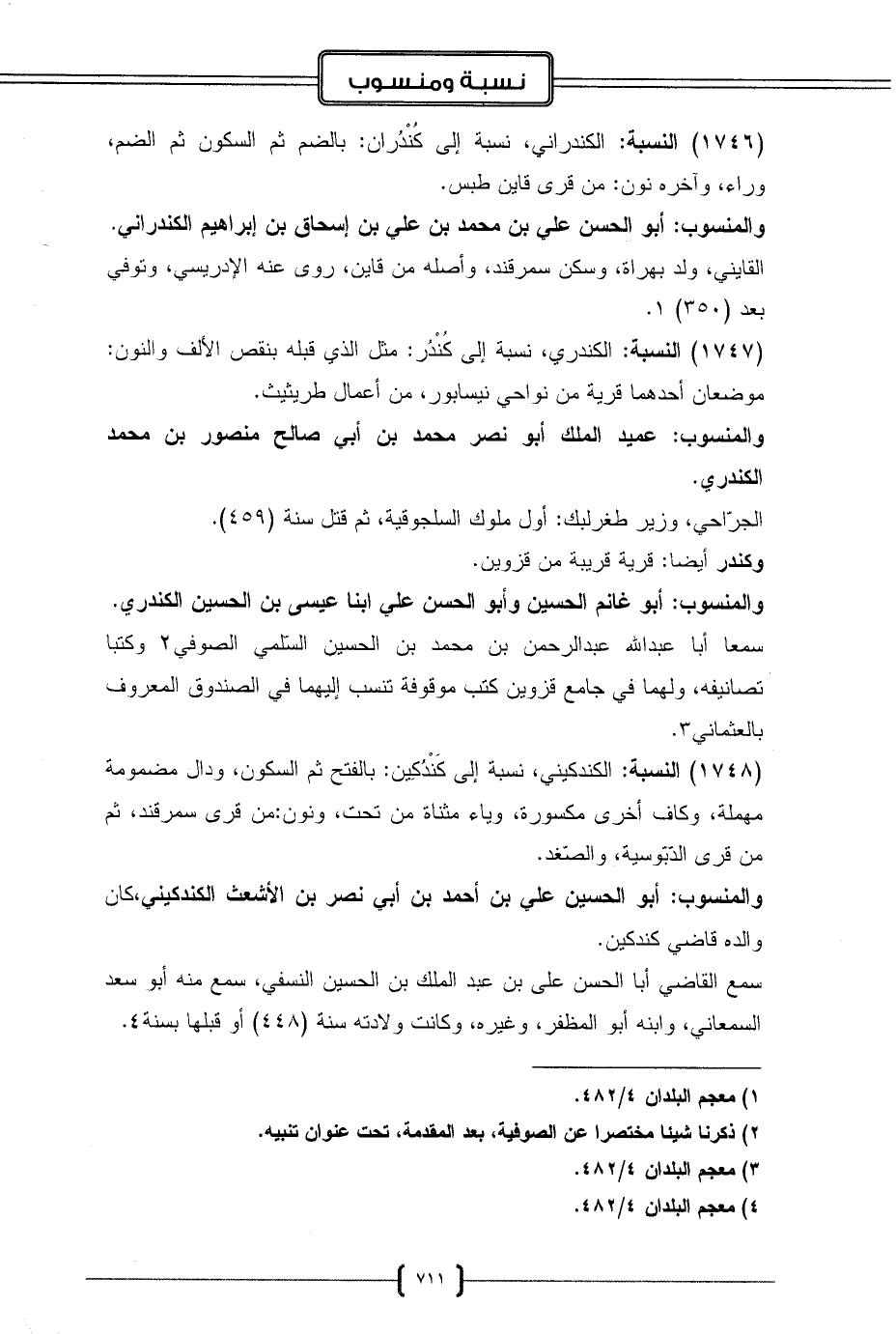 (1746) النسبة: الكندراني، نسبة إلى كُنْدُران: بالضم ثم السكون ثم الضم، وراء، وآخره نون: من قرى قاين طبس.