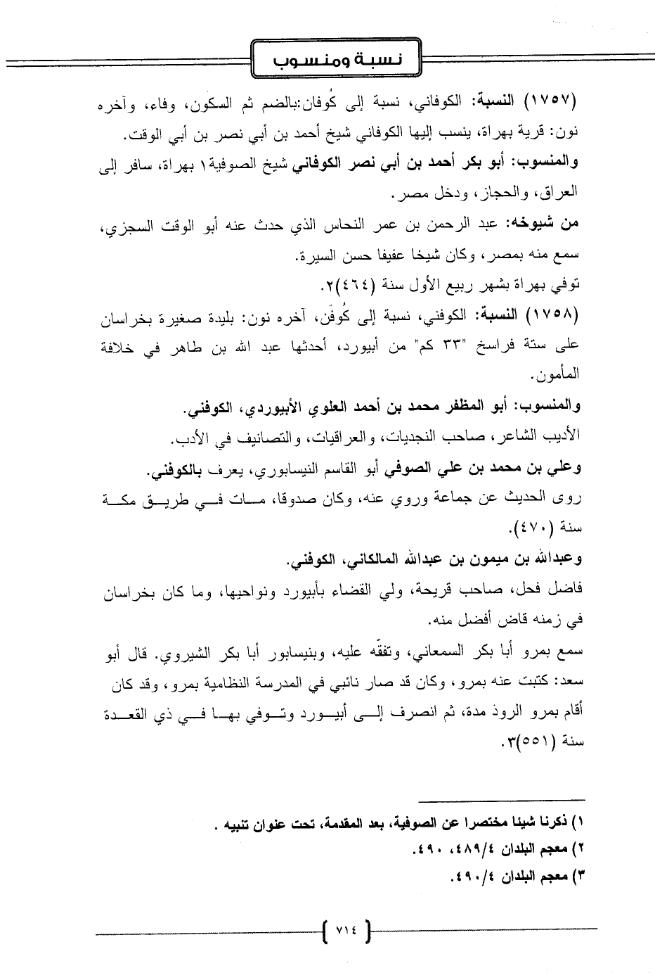 (1757) النسبة: الكوفاني، نسبة إلى كُوفان: بالضم ثم السكون، وفاء، وآخره نون: قرية بهراة، ينسب إليها الكوفاني شيخ أحمد بن أبي نصر بن أبي الوقت.