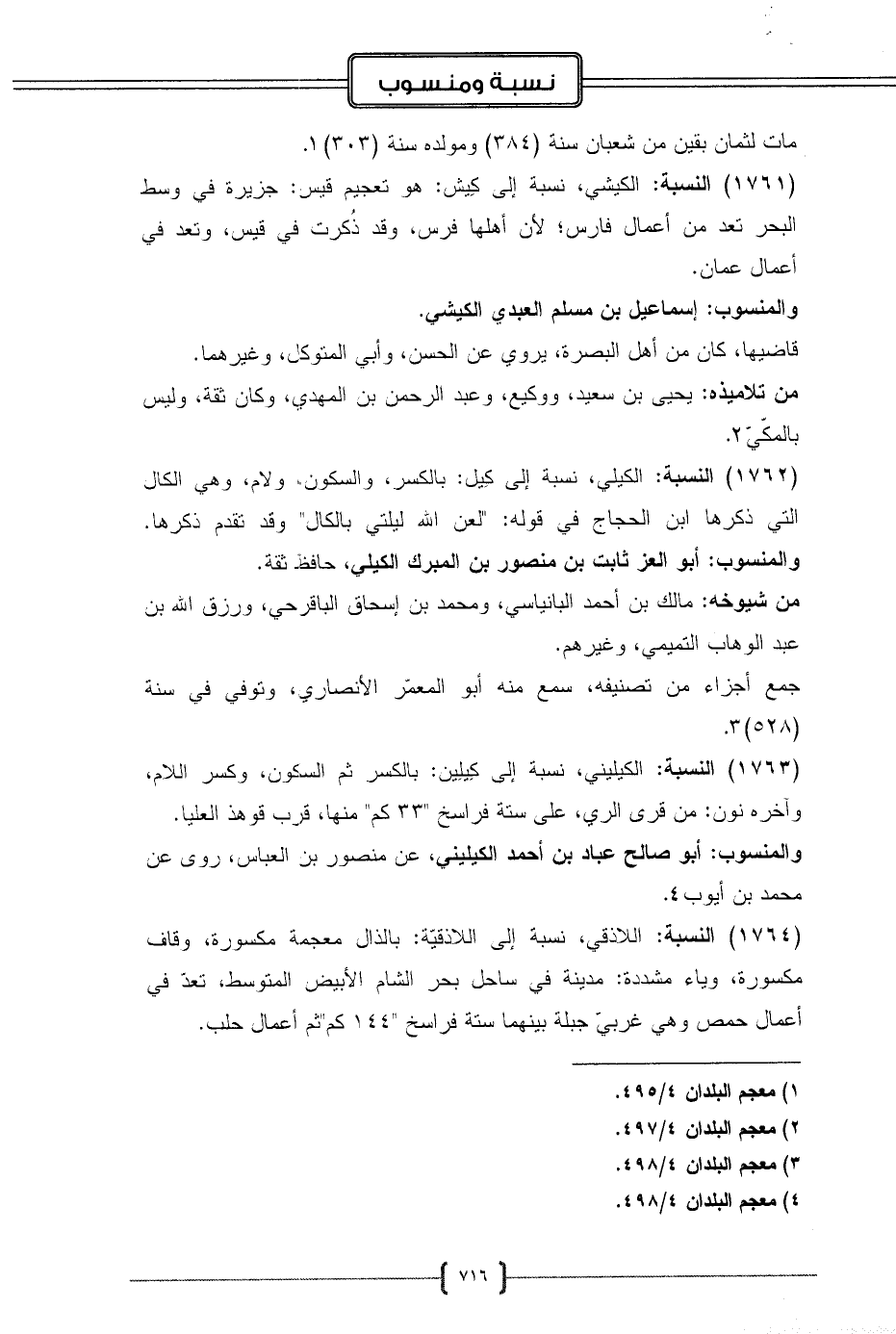 (1761) النسبة: الكيشي، نسبة إلى كِيش: هو تعجيم قيس: جزيرة في وسط البحر تعد من أعمال فارس؛ لأن أهلها فرس، وقد ذُكرت في قيس، وتعد في أعمال عمان.