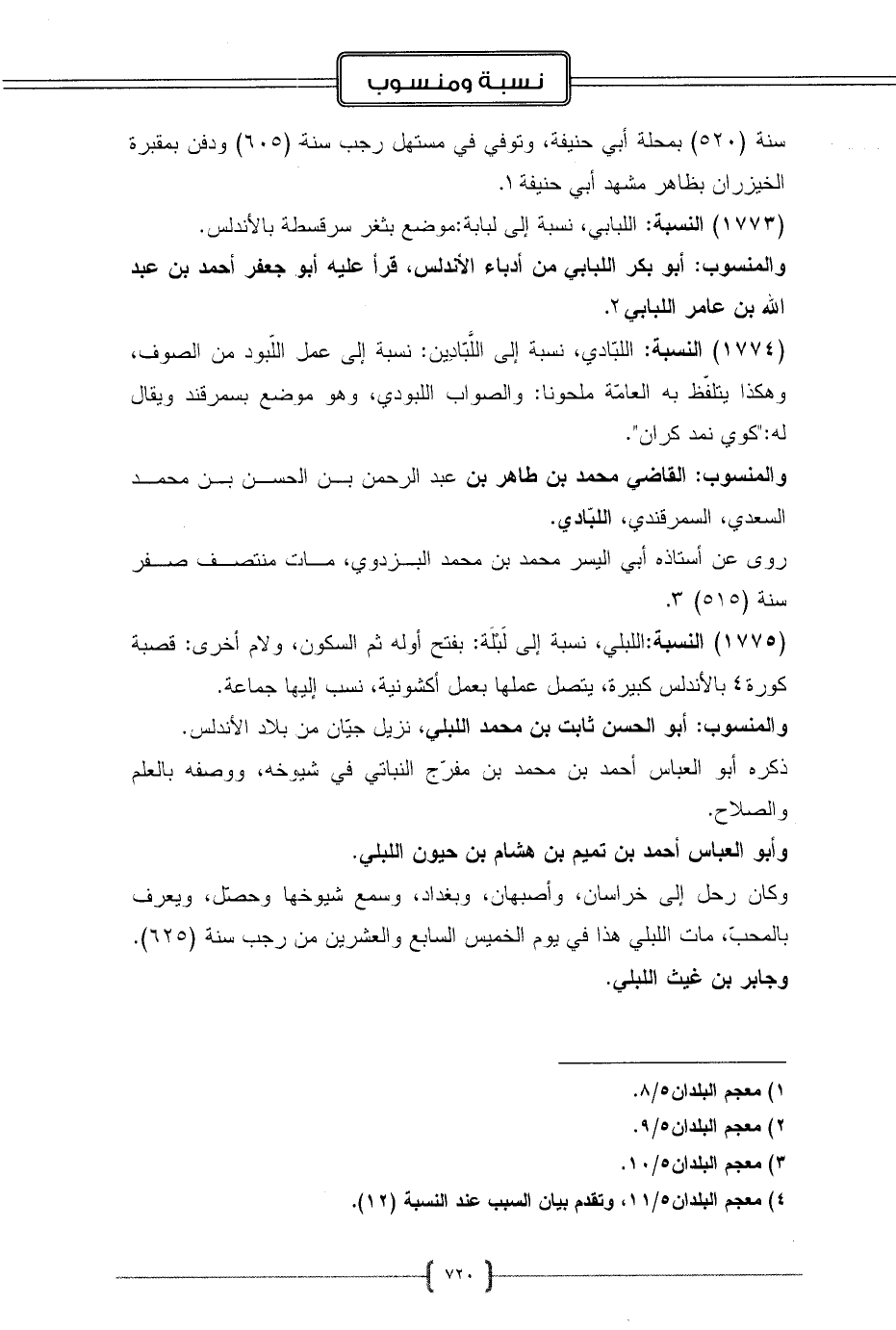 (1774) النسبة: اللبّادي، نسبة إلى اللَّبّادِين: نسبة إلى عمل اللّبود من الصوف، وهكذا يتلفّظ به العامّة ملحونا: والصواب اللبودي، وهو موضع بسمرقند ويقال له: "كوي نمد كران".