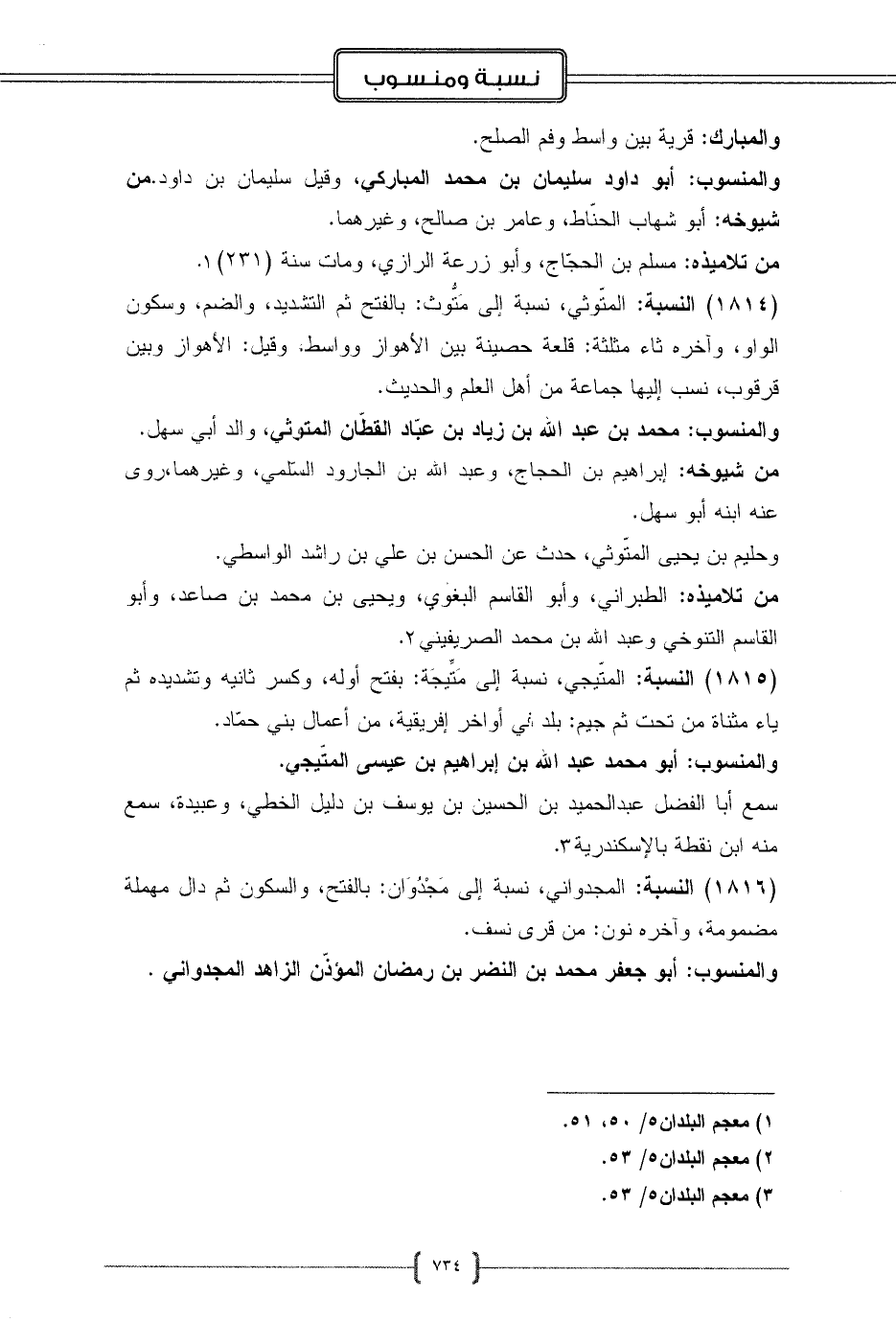 (1814) النسبة: المتّوثي، نسبة إلى مَتُّوث: بالفتح ثم التشديد، والضم، وسكون الواو، وآخره ثاء مثلثة: قلعة حصينة بين الأهواز وواسط، وقيل: الأهواز وبين قرقوب، نسب إليها جماعة من أهل العلم والحديث.