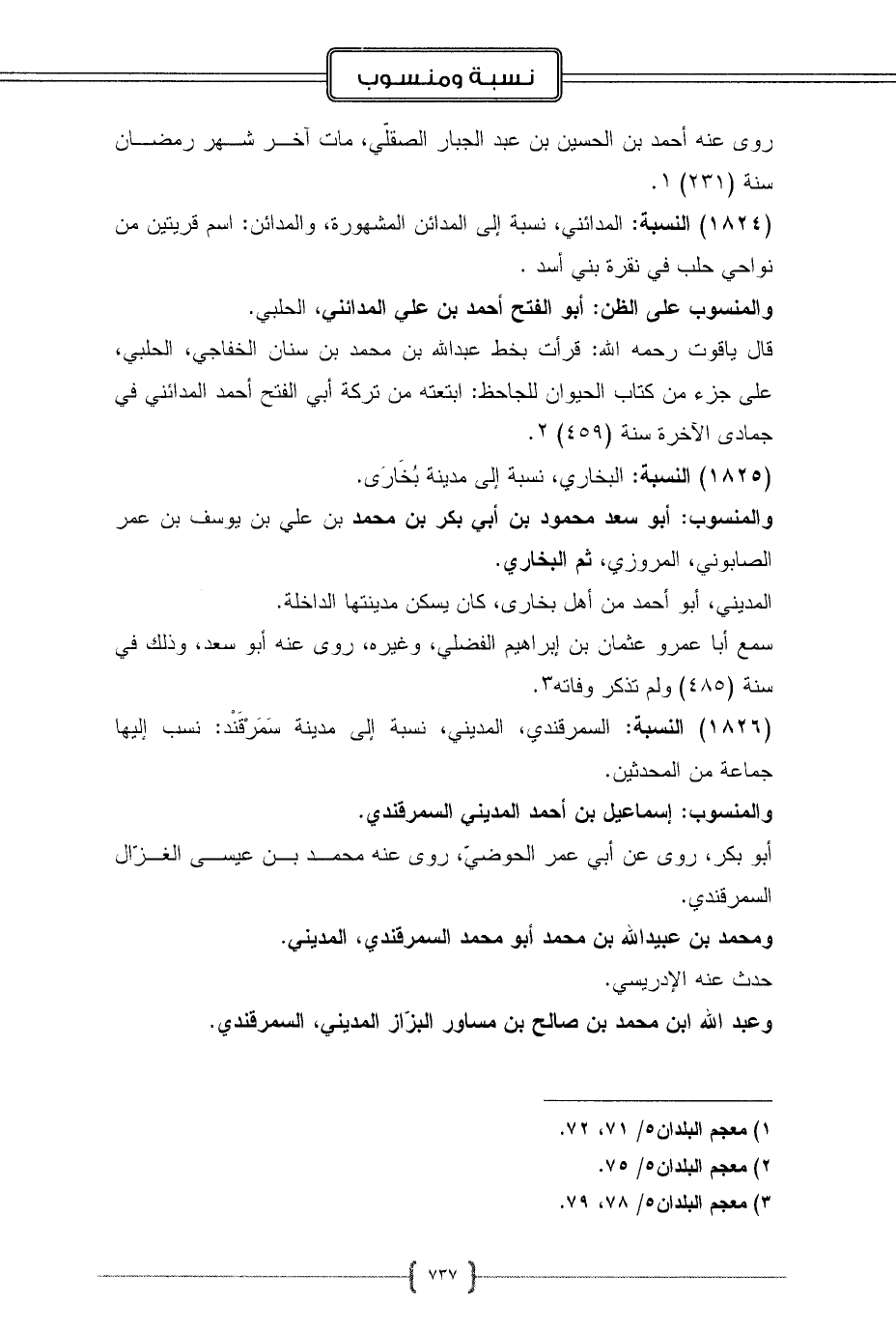 (1826) النسبة: السمرقندي، المديني، نسبة إلى مدينة سَمَرْقَنْد: نسب إليها جماعة من المحدثين.