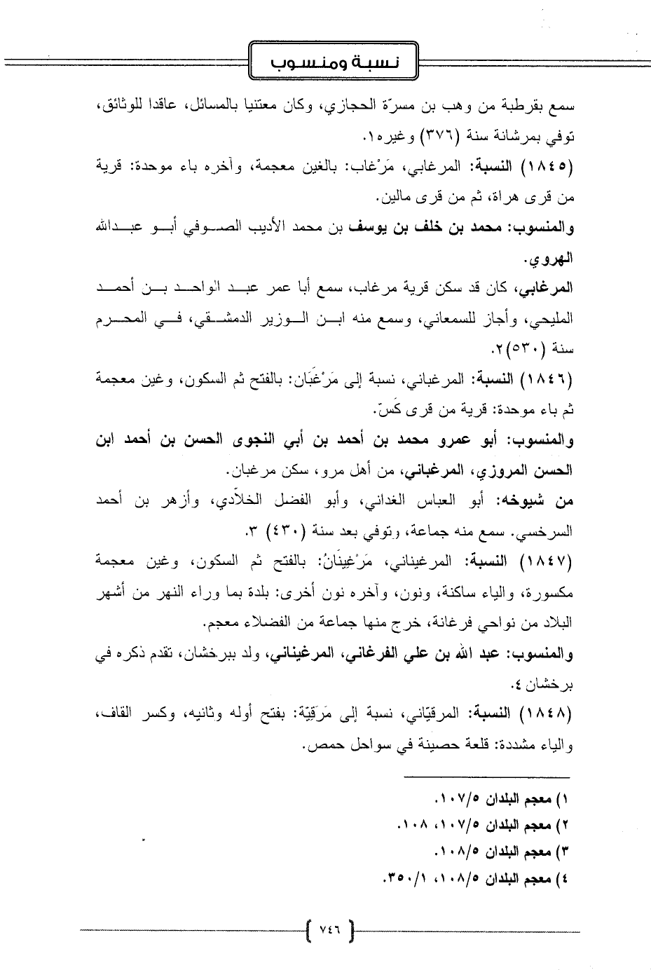 (1847) النسبة: المرغيناني، مَرْغِينَانُ: بالفتح ثم السكون، وغين معجمة مكسورة، والياء ساكنة، ونون، وآخره نون أخرى: بلدة بما وراء النهر من أشهر البلاد من نواحي فرغانة، خرج منها جماعة من الفضلاء معجم
