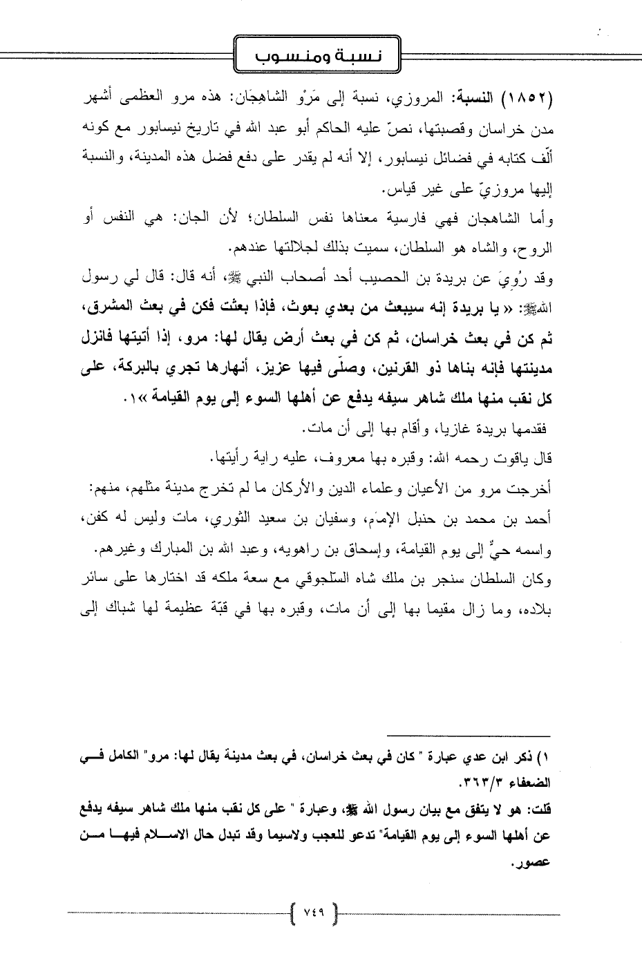 (1852) النسبة: المروزي، نسبة إلى مَرْو الشاهِجَان: هذه مرو العظمى أشهر مدن خراسان وقصبتها، نصّ عليه الحاكم أبو عبد الله في تاريخ نيسابور مع كونه ألّف كتابه في فضائل نيسابور، إلا أنه لم يقدر على دفع فضل هذه المدينة، والنسبة إليها مروزيّ على غير قياس.