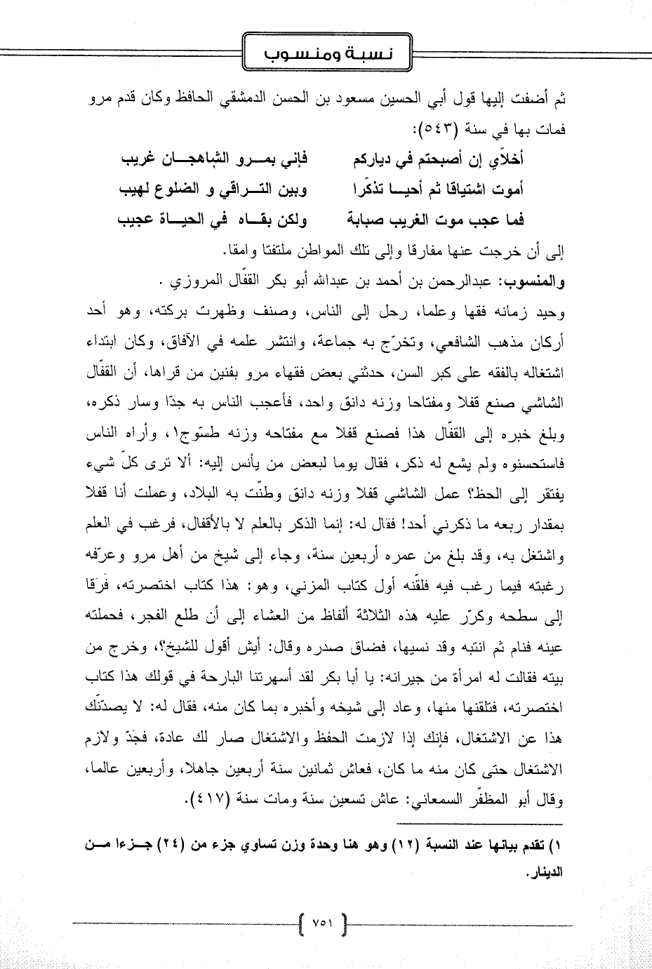 والمنسوب: عبد الرحمن بن أحمد بن عبد الله أبو بكر القفّال المروزي. وحيد زمانه فقها وعلما، رحل إلى الناس، وصنف وظهرت بركته، وهو أحد أركان مذهب الشافعي، وتخرّج به جماعة، وانتشر علمه في الآفاق، وكان ابتداء اشتغاله بالفقه على كبر السن، حدثني بعض فقهاء مرو بفنين من قراها، أن القفّال الشاشي صنع قفلا ومفتاحا وزنه دانق واحد، فأعجب الناس به جدّا وسار ذكره، وبلغ خبره إلى القفّال هذا فصنع قفلا مع مفتاحه وزنه طسّوج (¬1)،