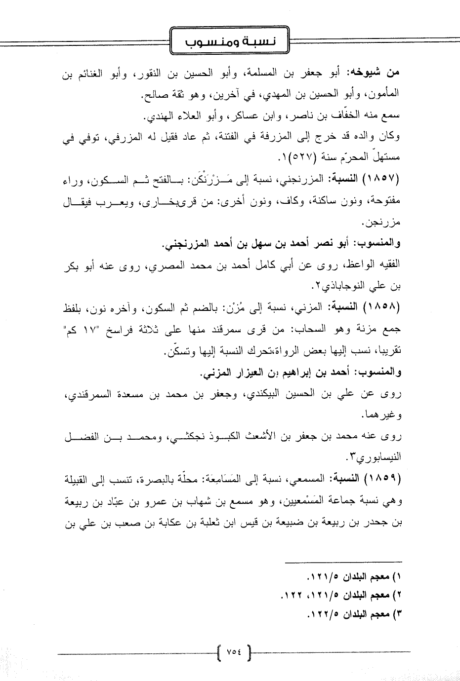 (1858) النسبة: المزني، نسبة إلى مُزْن: بالضم ثم السكون، وآخره نون، بلفظ جمع مزنة وهو السحاب: من قرى سمرقند منها على ثلاثة فراسخ "17 كم" تقريبا، نسب إليها بعض الرواة، تحرك النسبة إليها وتسكّن.