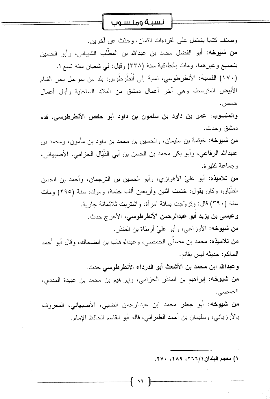 (170) النسبة: الأنطرطوسي، نسبة إلى أَنْطَرطُوس: بلد من سواحل بحر الشام الأبيض المتوسط، وهي آخر أعمال دمشق من البلاد الساحلية وأول أعمال حمص.