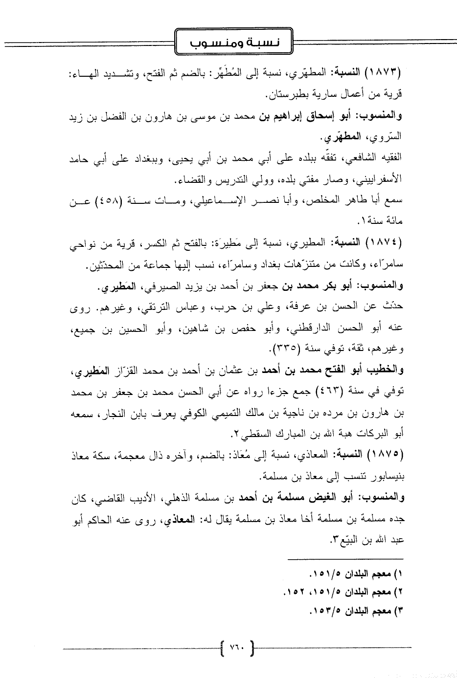 (1874) النسبة: المطيري، نسبة إلى مَطِيرَة: بالفتح ثم الكسر، قرية من نواحي سامرّاء، وكانت من متنزّهات بغداد وسامرّاء، نسب إليها جماعة من المحدّثين.