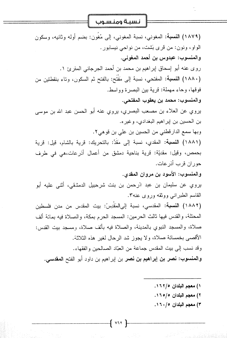 (1882) النسبة: المقدسي، نسبة إلى المَقْدِسُ: بيت المقدس من مدن فلسطين المحتلة، والقدس فيها ثالث الحرمين: المسجد الحرم بمكة، والصلاة فيه بمائة ألف صلاة، والمسجد النبوي بالمدينة، والصلاة فيه بألف صلاة، ومسجد بيت القدس: الأقصى بخمسائة صلاة، ولا يجوز شد الرحال لغير هذه الثلاثة.
