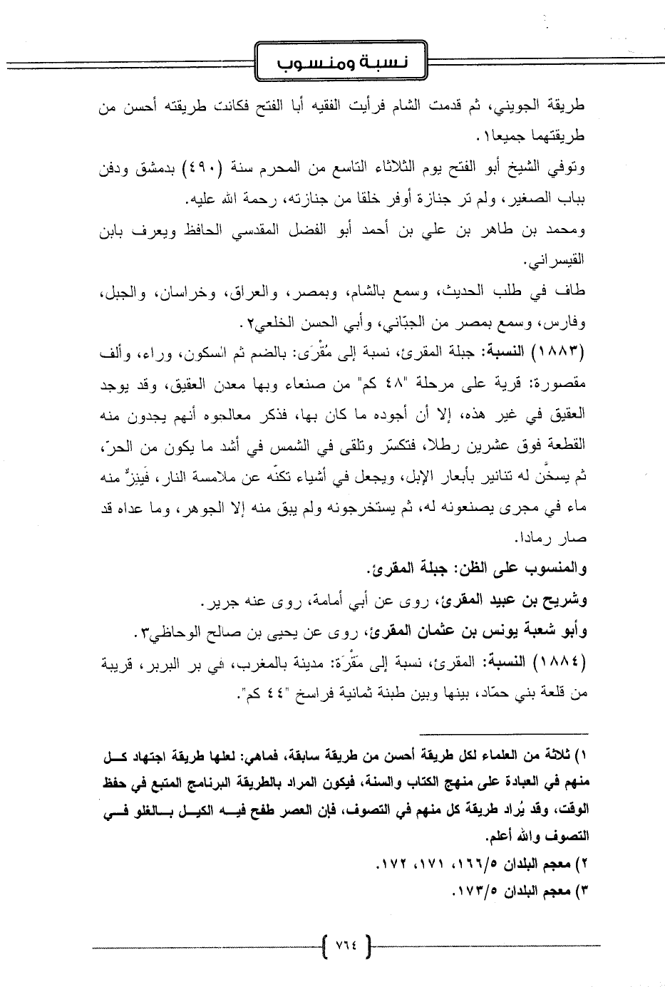 (1884) النسبة: المقرئ، نسبة إلى مَقْرَة: مدينة بالمغرب، في بر البربر، قريبة من قلعة بني حمّاد، بينها وبين طبنة ثمانية فراسخ "44 كم".