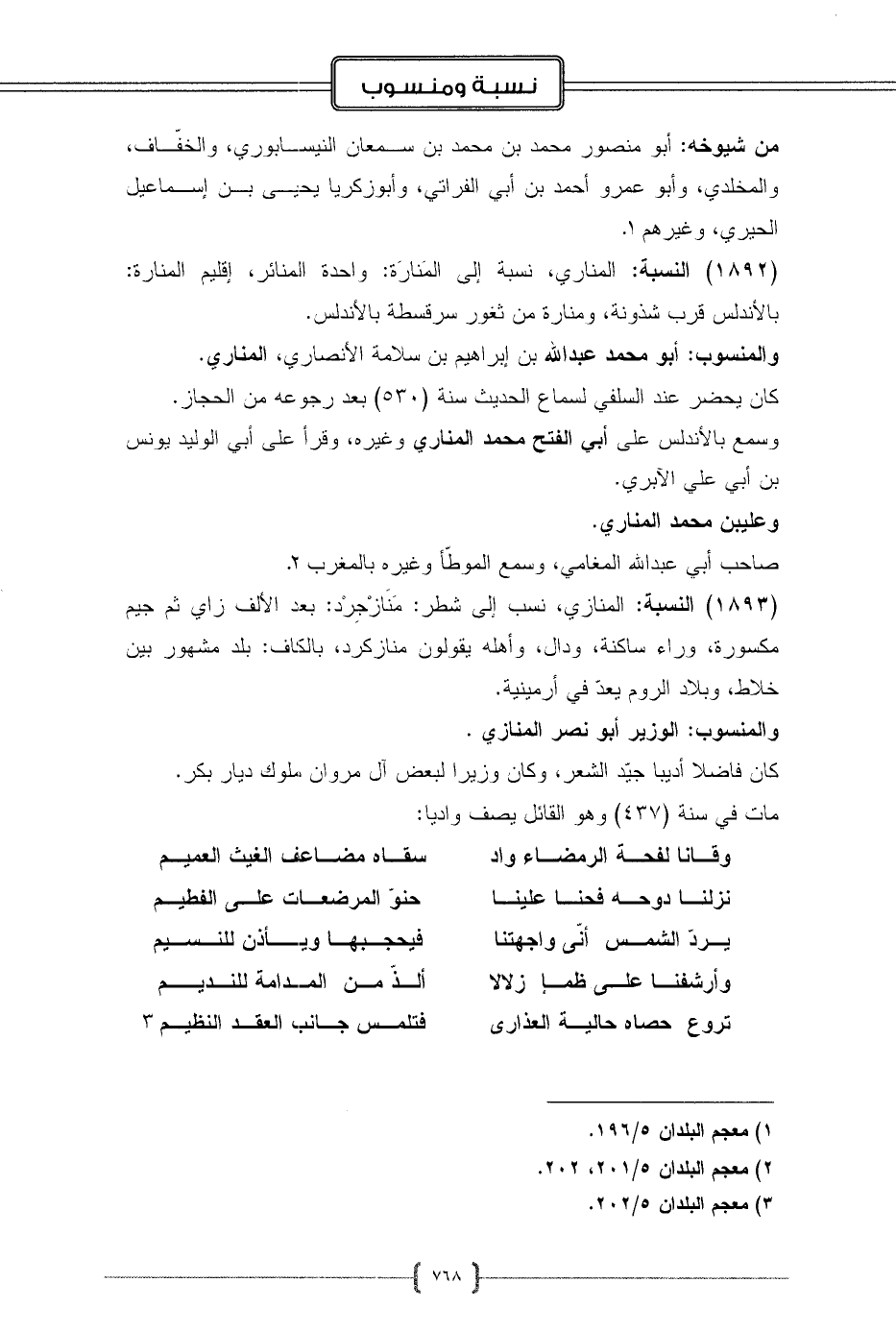 (1893) النسبة: المنازي، نسب إلى شطر: مَنَازْجِرْد: بعد الألف زاي ثم جيم مكسورة، وراء ساكنة، ودال، وأهله يقولون منازكرد، بالكاف: بلد مشهور بين خلاط، وبلاد الروم يعدّ في أرمينية.
