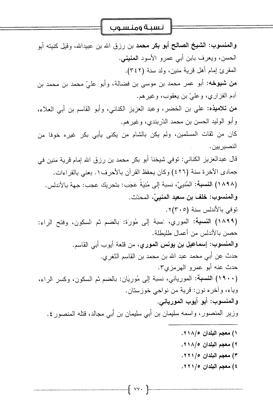 قال عبد العزيز الكناني: توفي شيخنا أبو بكر محمد بن رزق الله إمام قرية منين في جمادى الآخرة سنة (426) وكان يحفظ القرآن بالأحرف (¬1). يعني بالقراءات.
