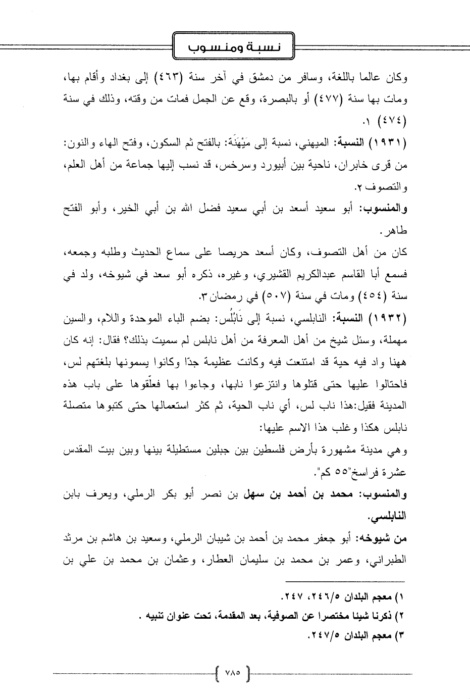 (1932) النسبة: النابلسي، نسبة إلى نَابُلُس: بضم الباء الموحدة واللام، والسين مهملة، وسئل شيخ من أهل المعرفة من أهل نابلس لم سميت بذلك؟ فقال: إنه كان ههنا واد فيه حية قد امتنعت فيه وكانت عظيمة جدّا وكانوا يسمونها بلغتهم لس، فاحتالوا عليها حتى قتلوها وانتزعوا نابها، وجاءوا بها فعلّقوها على باب هذه المدينة فقيل: هذا ناب لس، أي ناب الحية، ثم كثر استعمالها حتى كتبوها متصلة نابلس هكذا وغلب هذا الاسم عليها: