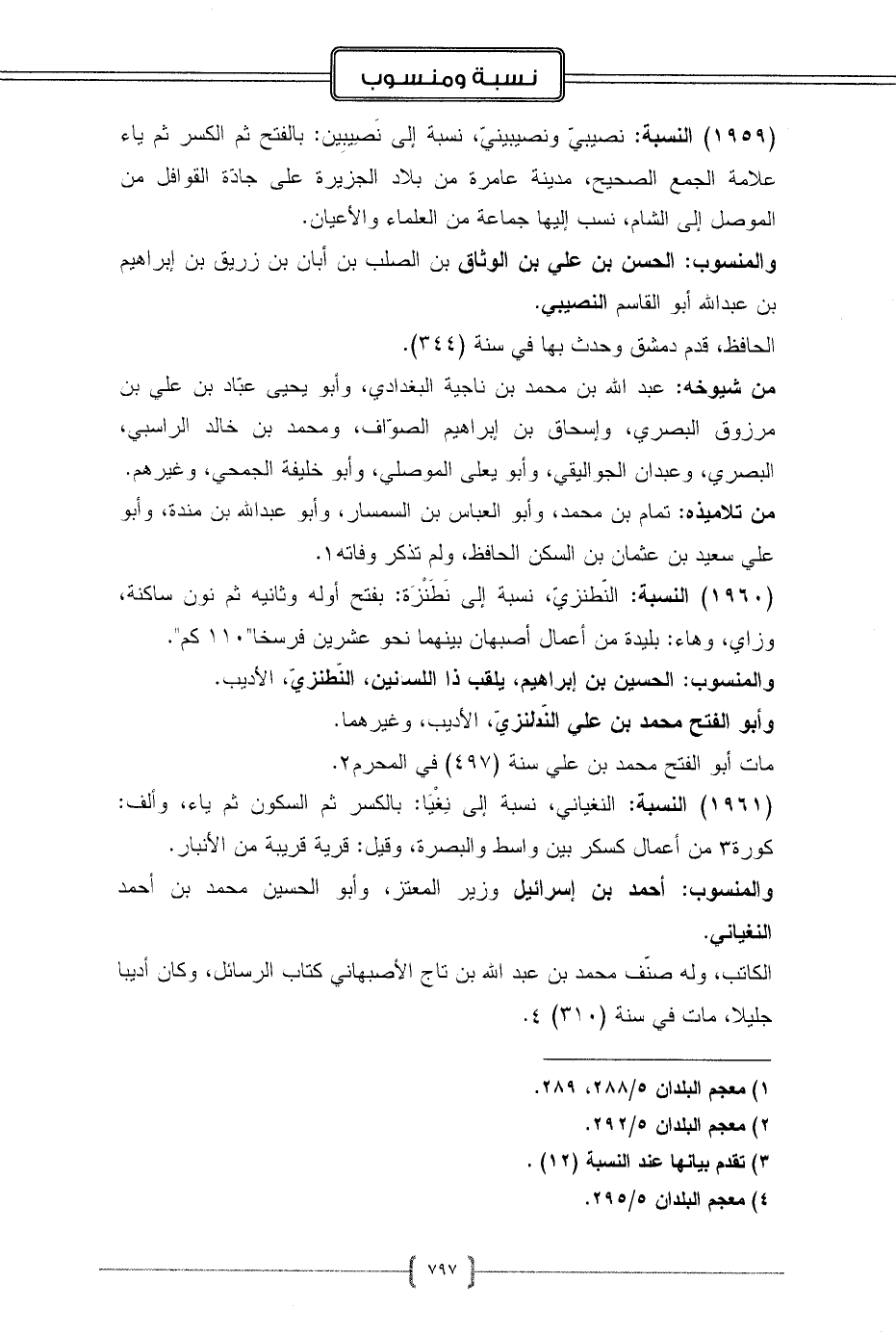(1959) النسبة: نصيبيّ ونصيبينيّ، نسبة إلى نَصِيبِين: بالفتح ثم الكسر ثم ياء علامة الجمع الصحيح، مدينة عامرة من بلاد الجزيرة على جادّة القوافل من الموصل إلى الشام، نسب إليها جماعة من العلماء والأعيان.