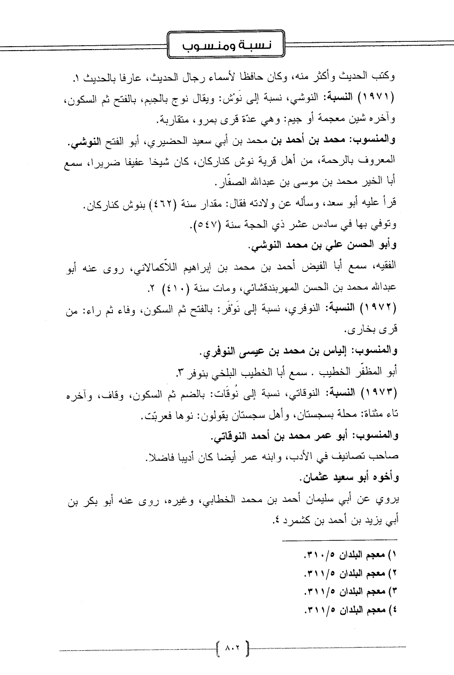 (1971) النسبة: النوشي، نسبة إلى نَوْش: ويقال نوج بالجيم، بالفتح ثم السكون، وآخره شين معجمة أو جيم: وهي عدّة قرى بمرو، متقاربة.