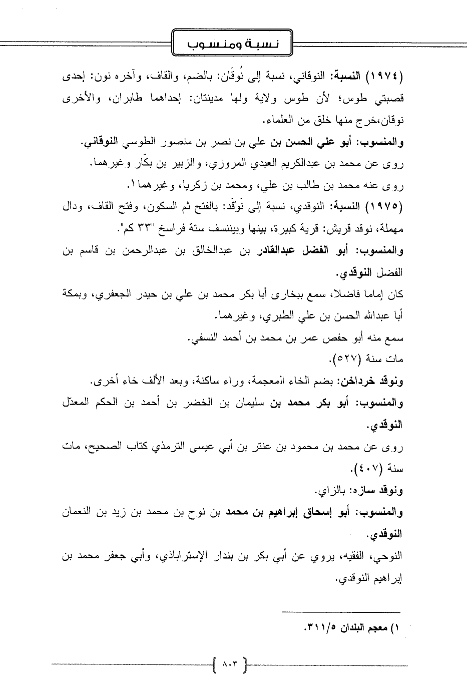 (1975) النسبة: النوقدي، نسبة إلى نَوْقَد: بالفتح ثم السكون، وفتح القاف، ودال مهملة، نوقد قريش: قرية كبيرة، بينها وبين نسف ستة فراسخ "33 كم".