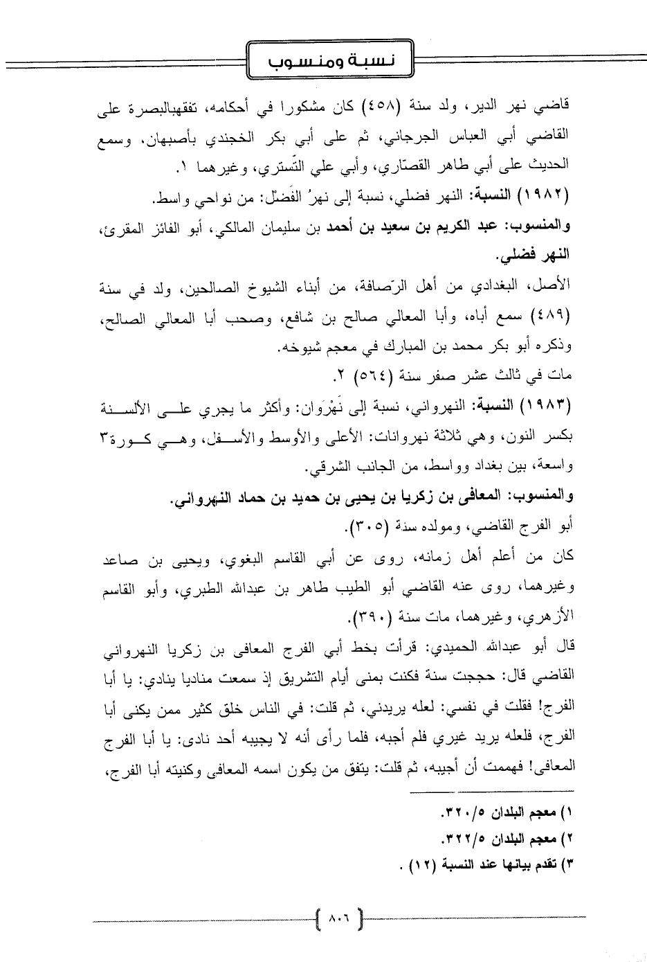 (1983) النسبة: النهرواني، نسبة إلى نَهْرَوان: وأكثر ما يجري على الألسنة بكسر النون، وهي ثلاثة نهروانات: الأعلى والأوسط والأسفل، وهي كورة (¬3) واسعة، بين بغداد وواسط، من الجانب الشرقي.