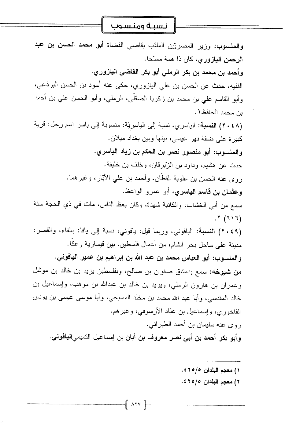 (2048) النسبة: الياسري، نسبة إلى الياسِرِيّة: منسوبة إلى ياسر اسم رجل: قرية كبيرة على ضفة نهر عيسى، بينها وبين بغداد ميلان.