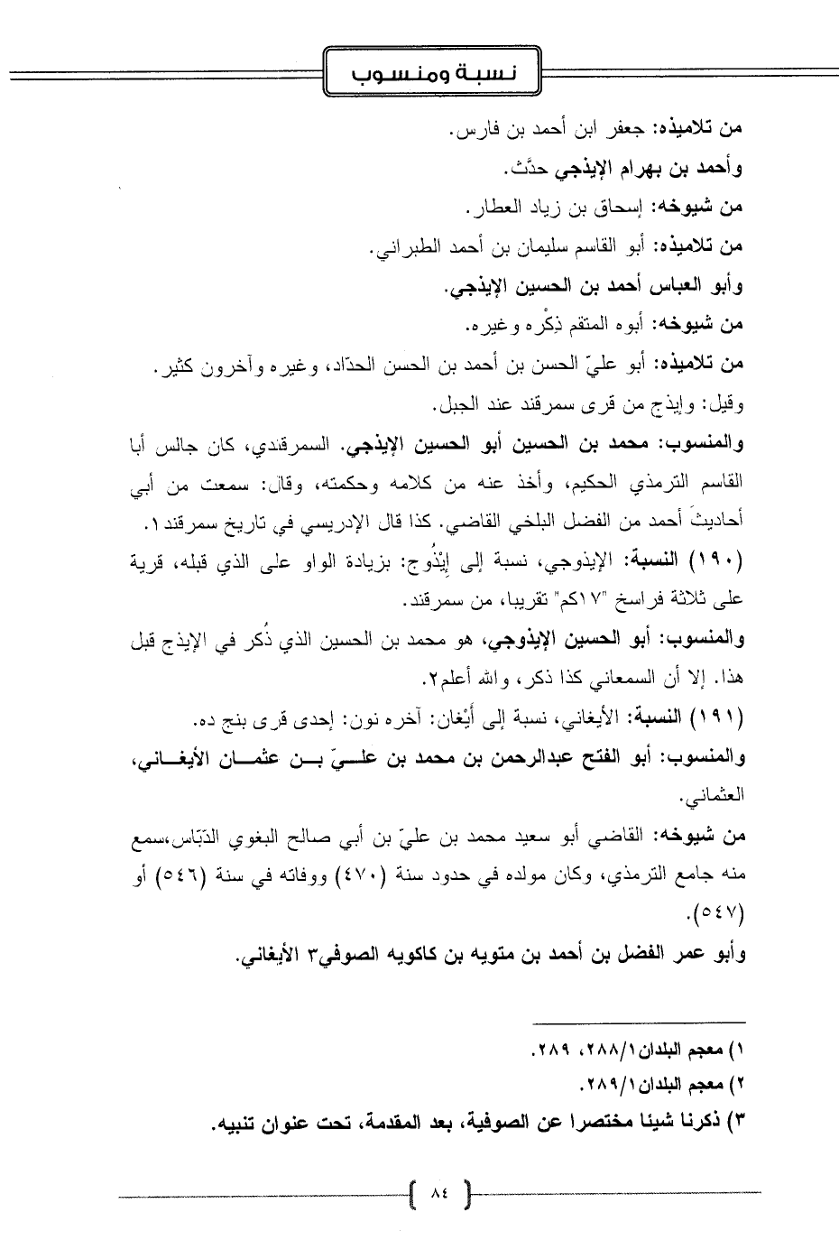 (190) النسبة: الإيذوجي، نسبة إلى إِيْذُوج: بزيادة الواو على الذي قبله، قرية على ثلاثة فراسخ "17 كم" تقريبا، من سمرقند.