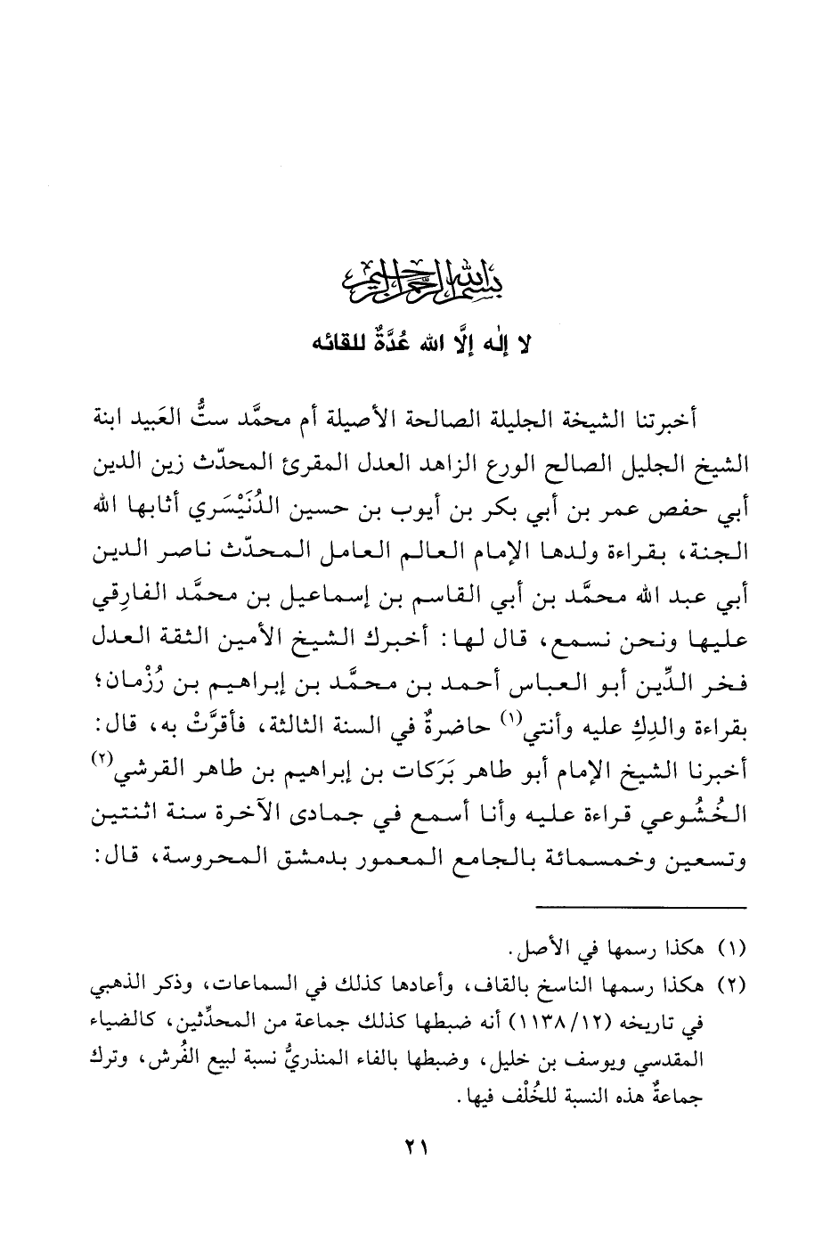 أخبرنا الشيخة الجليلة الصالحة الأصيلة أم محمد ست العبيد ابنة الشيخ الجليل الصالح الورع الزاهد العدل المقرىء المحدث زين الدين أبي حفص عمر بن أبي بكر بن أيوب بن حسين الدنيسري أثابها الله الجنة، بقراءة ولدها الإمام العالم العامل المحدث ناصر الدين أبي عبد الله محمد بن أبي القاسم بن إسماعيل بن محمد الفارقي عليها ونحن نسمع، قال لها: أخبرك الشيخ الأمين الثقة العدل فخر الدين أبو العباس أحمد بن محمد بن إبراهيم بن رزمان، بقراءة والدك عليه وأنتي حاضرة في السنة الثالثة، فأقرت به، قال: أخبرنا الشيخ الإمام أبو طاهر بركات بن إبراهيم بن طاهر القرشي الخشوعي قراءة عليه وأنا أسمع في جمادي الآخرة سنة اثنين وتسعين وخمسمائة بالجامع المعمور بدمشق المحروسة، قال: