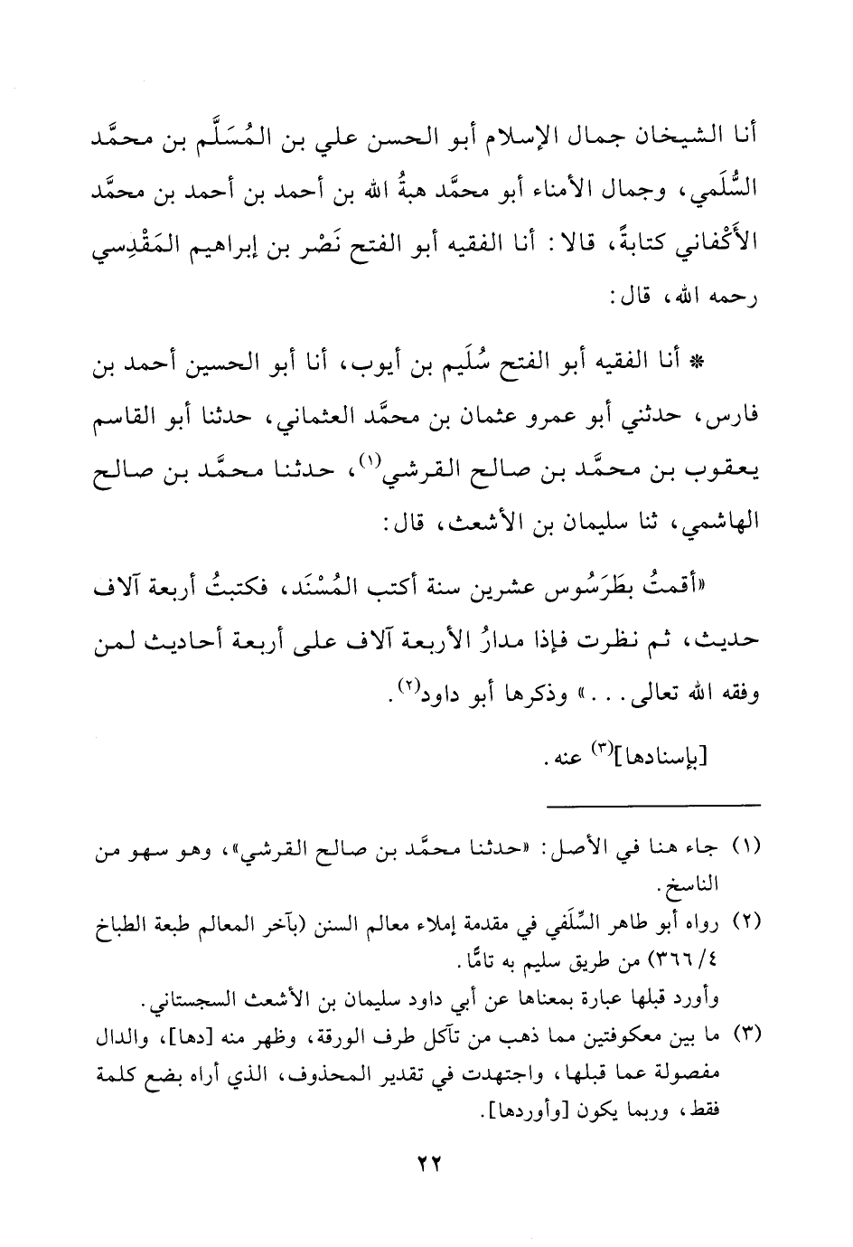 - أنا الفقيه أبو الفتح سليم بن أيوب، أنا أبو الحسين أحمد بن فارس، حدثني أبو عمرو عثمان بن محمد العثماني، حدثنا أبو القاسم يعقوب بن محمد بن صالح القرشي، حدثنا محمد بن صالح الهاشمي، ثنا سليمان بن الأشعث، قال: "أقمت بطرسوس عشرين سنة أكثر المسند، فكتبت أربعة آلاف حديث، ثم نظرت فإذا مدار الأربعة آلاف على أربعة أحاديث لمن وفقه الله تعالى ..... " وذكرها أبو داود.