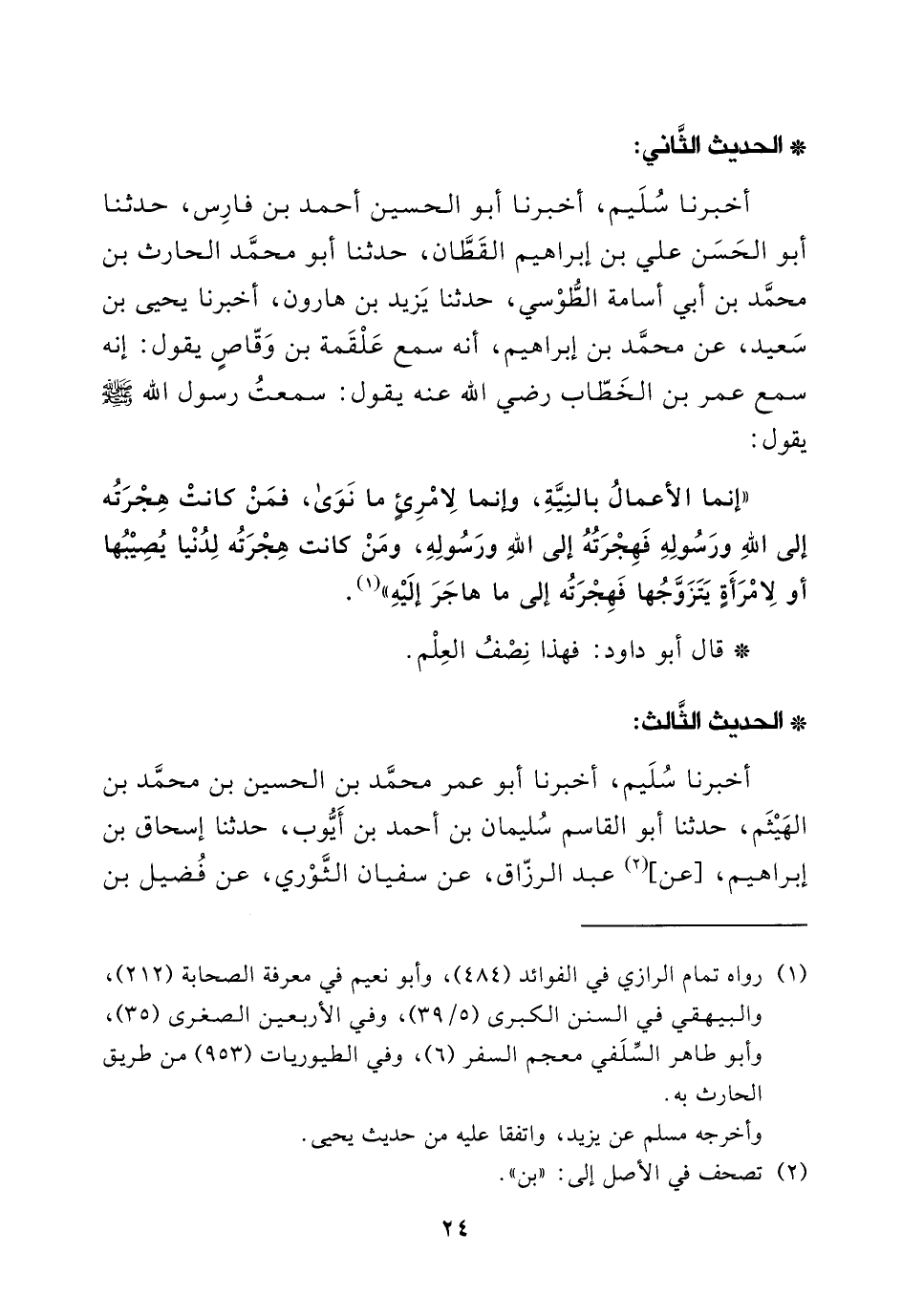 أخبرنا سليم، أخبرنا أبو الحسين أحمد بن فارس، حدثنا أبو الحسن علي بن إبراهيم القطان، حدثنا أبو محمد الحارث بن محمد بن أبي أسامة الطوسي، حدثنا يزيد بن هارون، أخبرنا يحيى بن سعيد، عن محمد بن إبراهيم، أنه سمع علقمة بن وقاص يقول: إنه سمع عمر بن الخطاب رضي الله عنه يقول: سمعت رسول الله صلى الله عليه وسلم يقول: