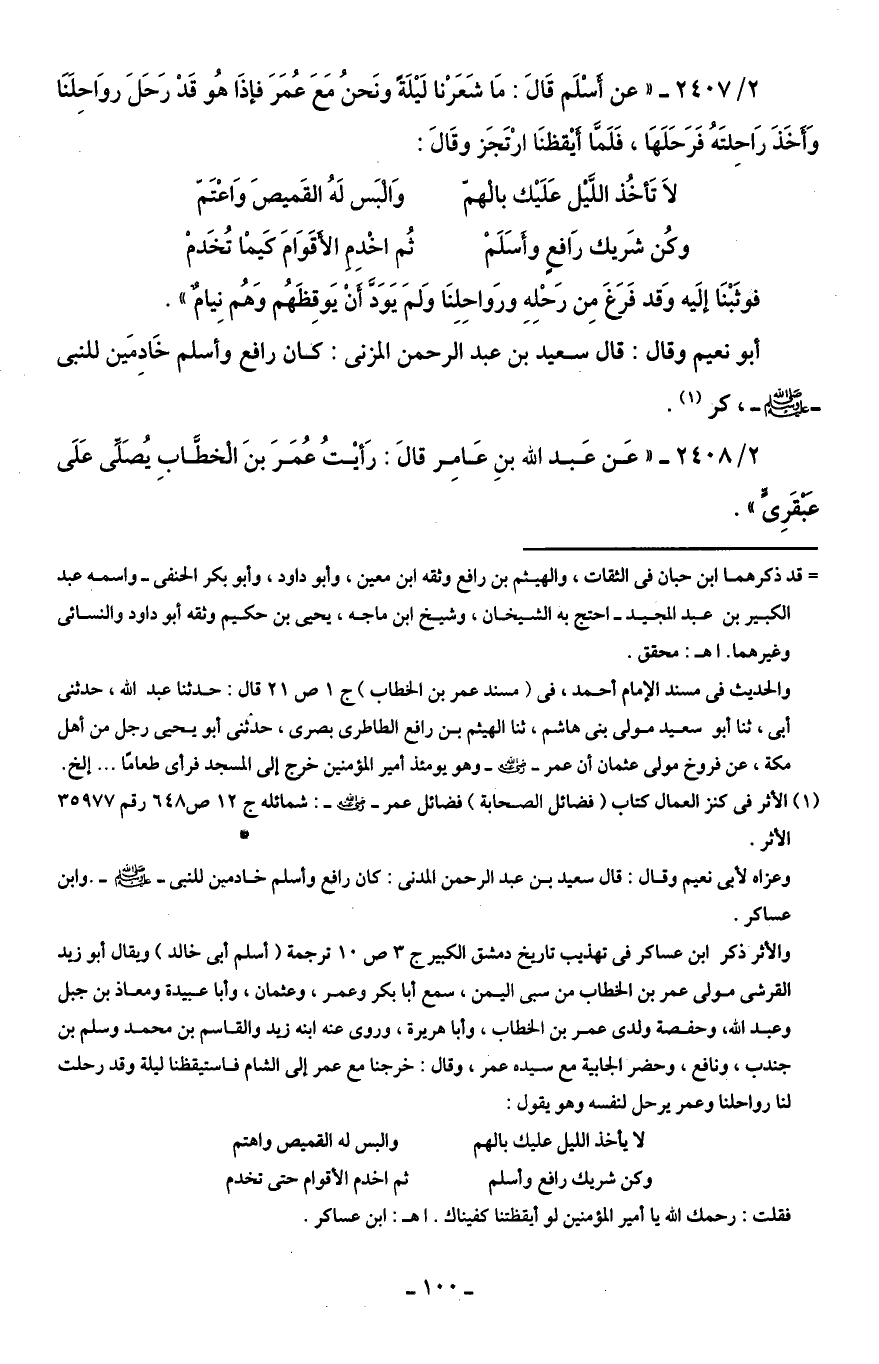2/ 2407 - "عن أَسْلَم قَالَ: مَا شَعَرْنا لَيْلَةً ونَحْنُ مَعَ عُمَرَ فإذَا هُو قَدْ رَحَلَ روَاحِلَنَا وَأَخَذَ رَاحِلتَهُ فَرَحَلَهَا، فَلَمَّا أَيْقظنَا ارْتَجَز وقَالَ: