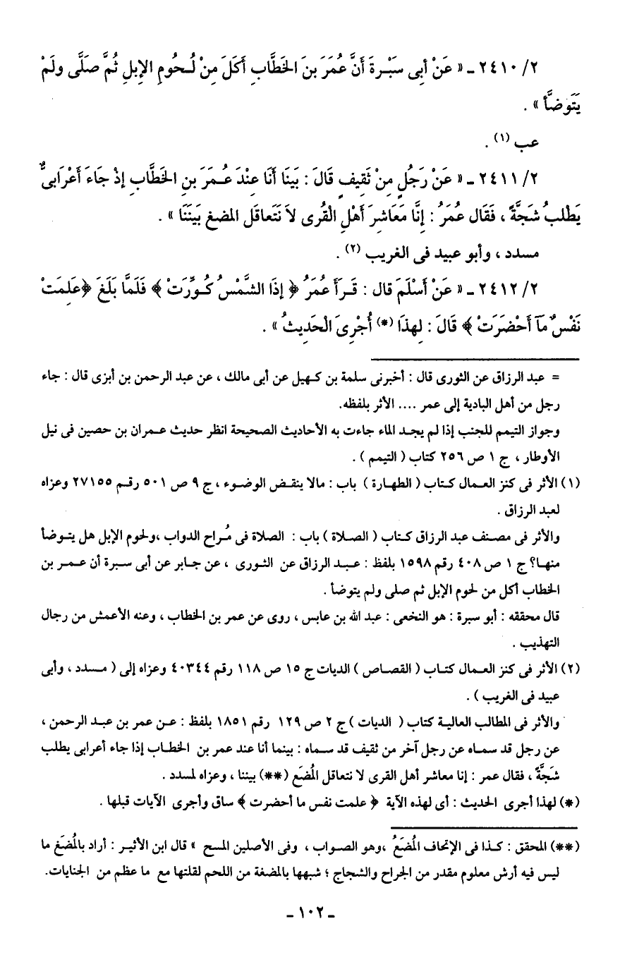 2/ 2410 - "عَنْ أَبِى سَبْرةَ أَنَّ عُمَرَ بنَ الخَطَّابِ أَكَلَ مِنْ لُحُومِ الإِبلِ ثُمَّ صَلَّى ولَمْ يَتَوضَّأ".