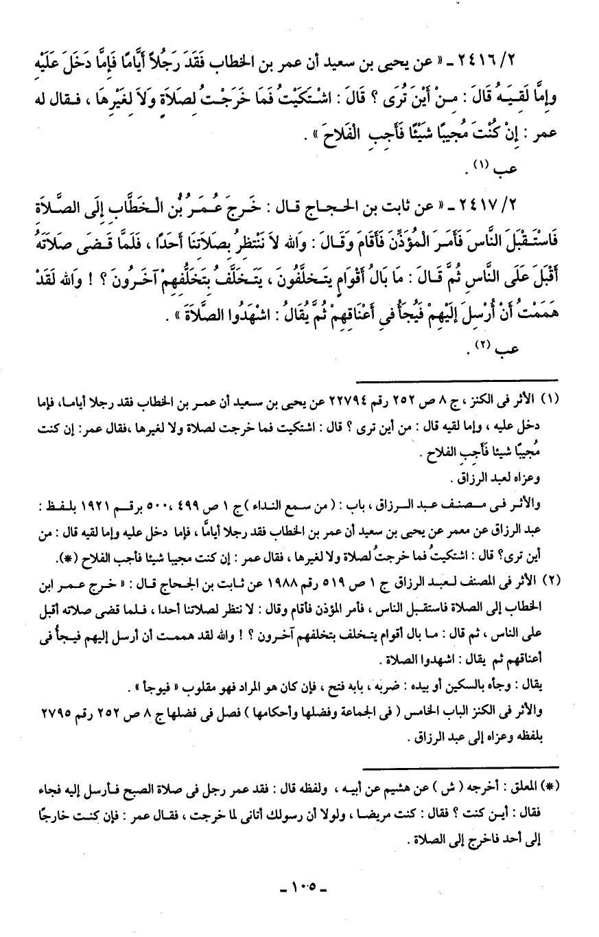 (¬2) الأثر في المصنف لعبد الرزاق جـ 1 ص 519 رقم 1988 عن ثابت بن الجحاج قال: "خرج عمر ابن الخطاب إلى الصلاة فاستقبل الناس، فأمر المؤذن فأقام وقال: لا ننظر لصلاتنا أحدا، فلما قضى صلاته أقبل على الناس، ثم قال: ما بال أقوام يتخلف بتخلفهم آخرون؟ ! واللَّه لقد هممت أن أرسل اليهم فيجأُ في أعناقهم ثم يقال: اشهدوا الصلاة.