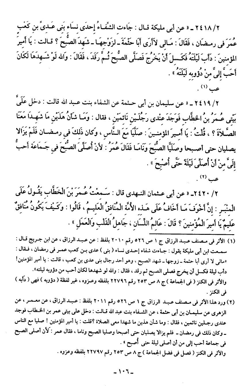 (¬1) الأثر في مصنف عبد الرزاق جـ 1 ص 526 رقم 2010 بلفظ: عن عبد الرزاق، عن ابن جريج قال: سمعت ابن أَبى مليكة يقول: جاءت شفاء إحدى نساء (بنى) عدى بن كعب عمر في رمضان، فقال: "ما لى لا أرى أبا حثمة -زوجها- شهد الصبح، وهو أحد رجال بنى عدى بن كعب، قالت: يا أمير المؤمنين! دأب ليلة فكسل أن يخرج فصلى الصبح ثم رقد، فقال: واللَّه لو شهدها لكان أحب من دؤوبه ليلته".