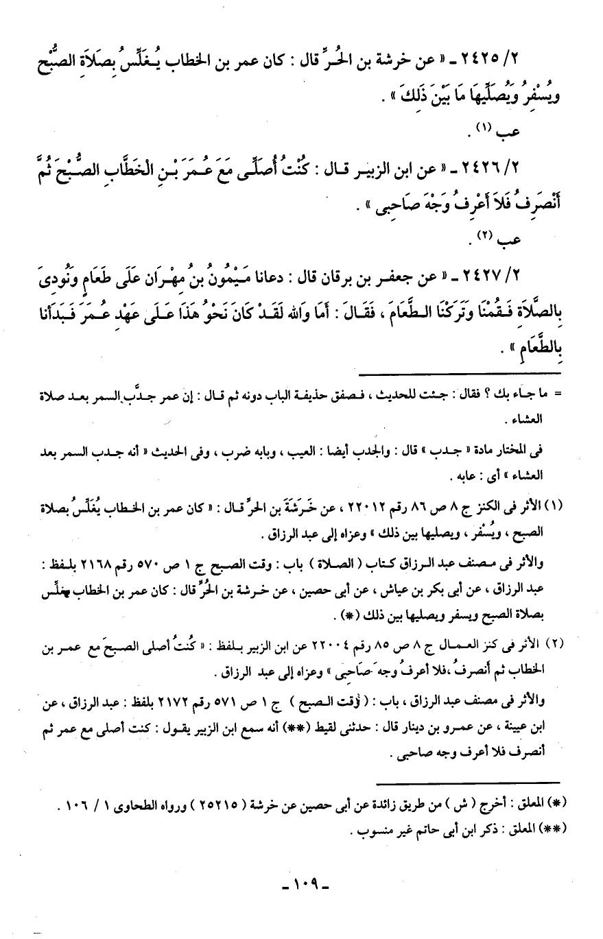 2/ 2425 - "عن خرشة بن الحُرِّ قال: كان عمر بن الخطاب يُغَلِّسُ بِصَلَاةِ الصُّبْح ويُسْفِرُ وَيُصَلِّيهَا مَا بَيْنَ ذَلِكَ".