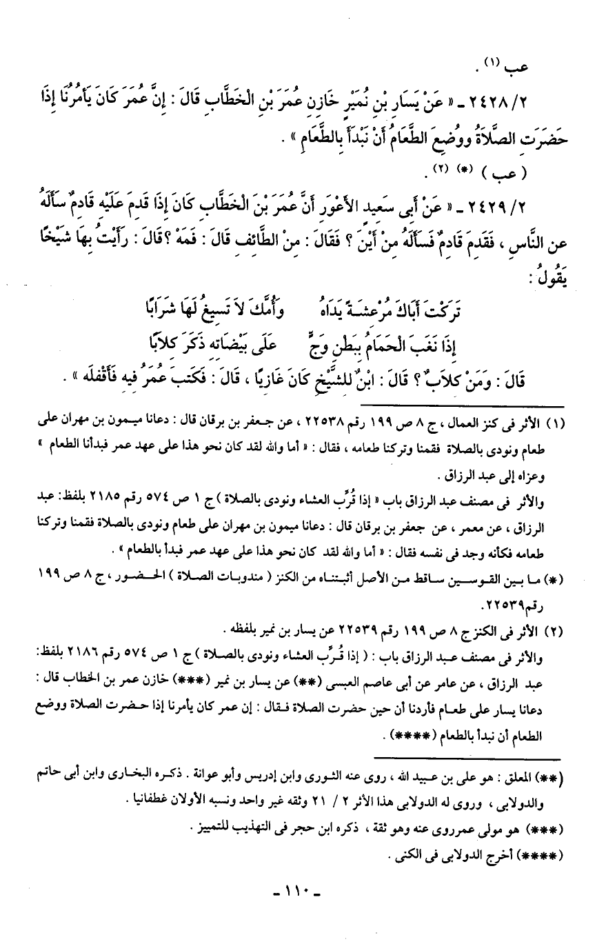 2/ 2428 - "عَنْ يَسَارِ بْنِ نُمَيْرٍ خَازِنِ عُمَرَ بْنِ الْخَطَّابِ قَالَ: إِنَّ عُمَرَ كَانَ يَأمُرُنَا إِذَا حَضَرَتِ الصَّلَاةُ ووضُعَ الطَّعَامُ أَنْ نَبْدَأَ بِالطَّعَامِ".