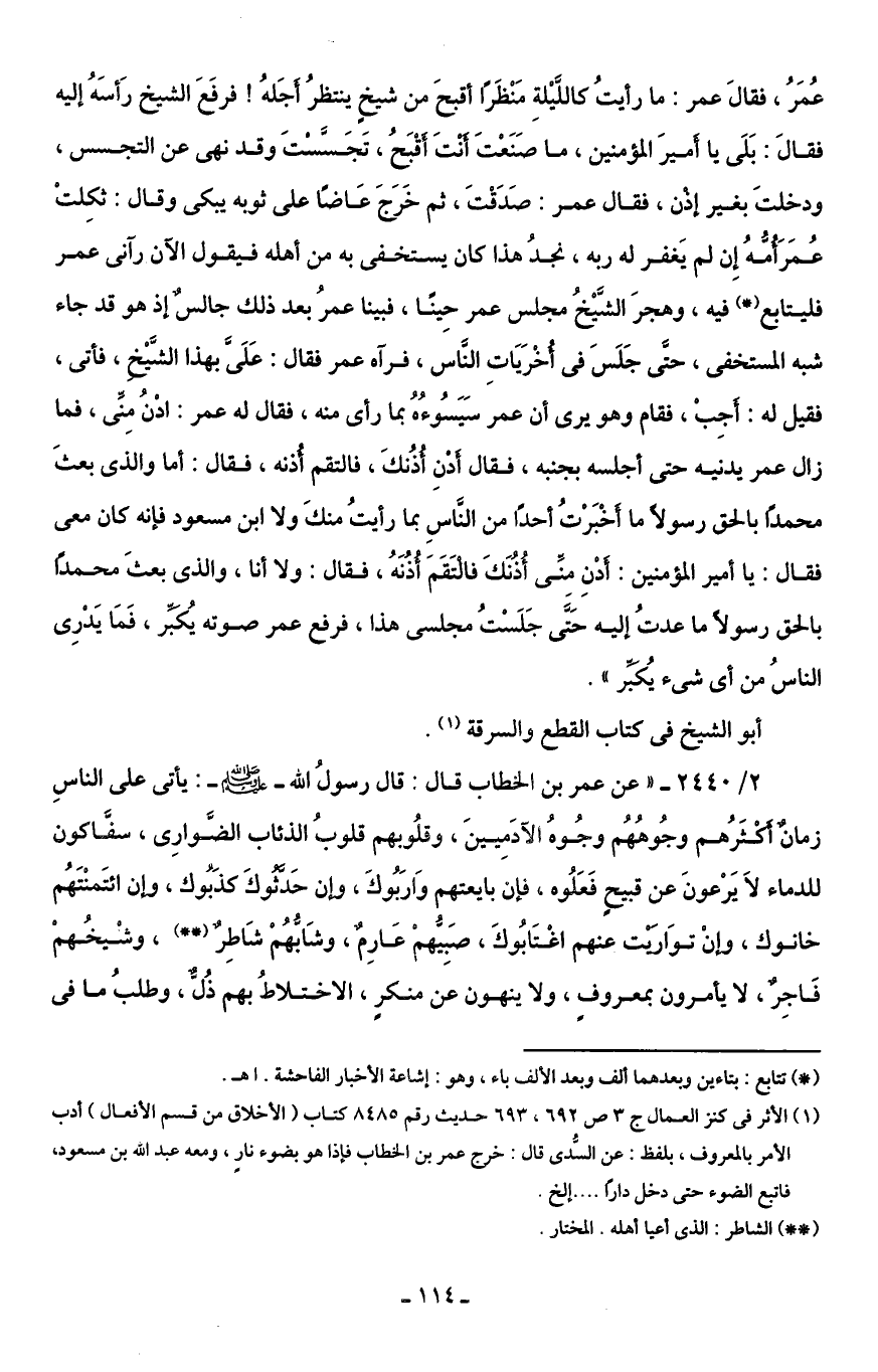 (¬1) الأثر في كنز العمال جـ 3 ص 692، 693 حديث رقم 8485 كتاب (الأخلاق من قسم الأفعال) أدب الأمر بالمعروف، بلفظ: عن السُّدى قال: خرج عمر بن الخطاب فإذا هو بضوء نارٍ، ومعه عبد اللَّه بن مسعود، فاتبع الضوء حتى دخل دارًا. . . إلخ.
